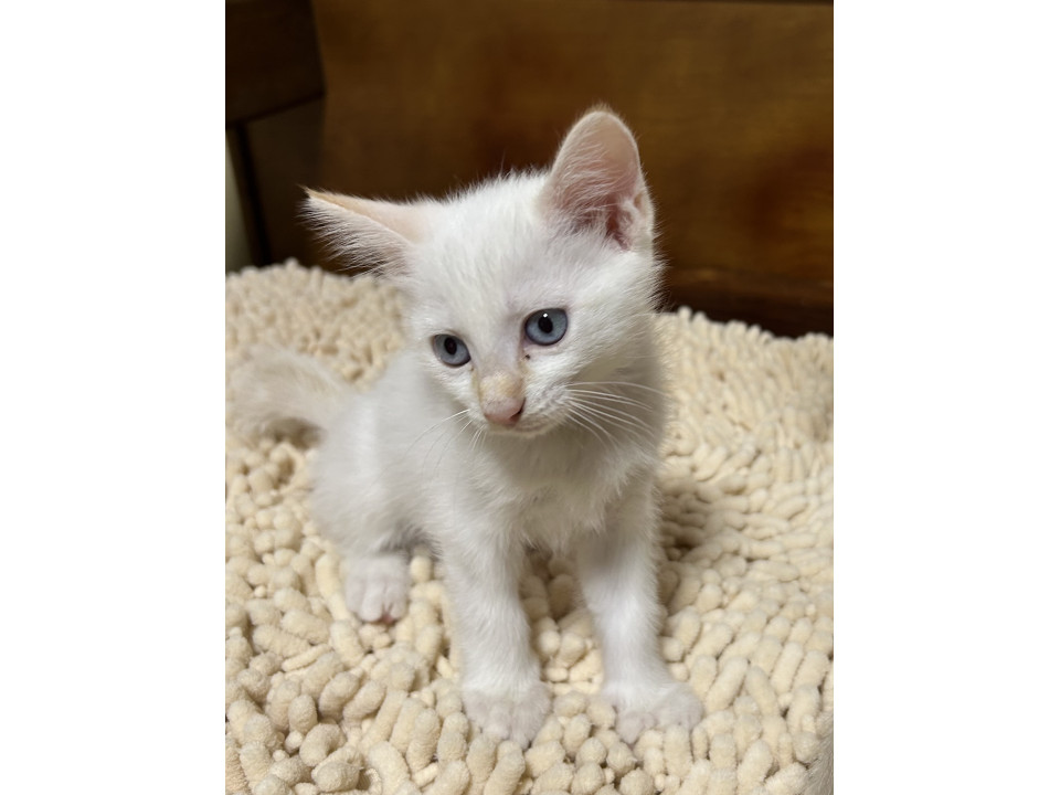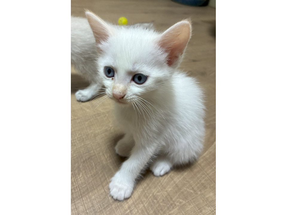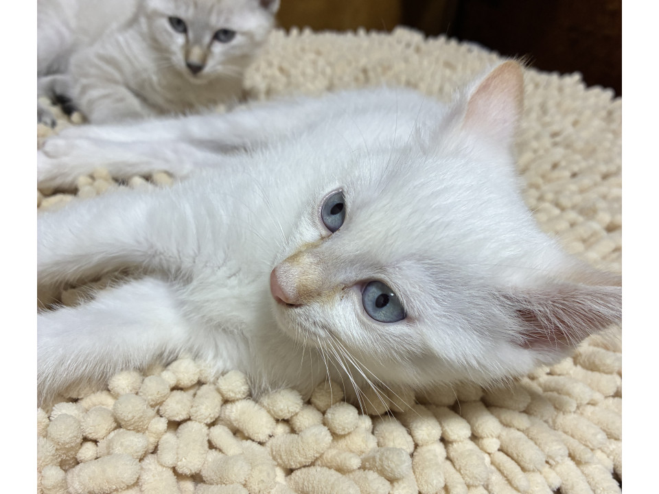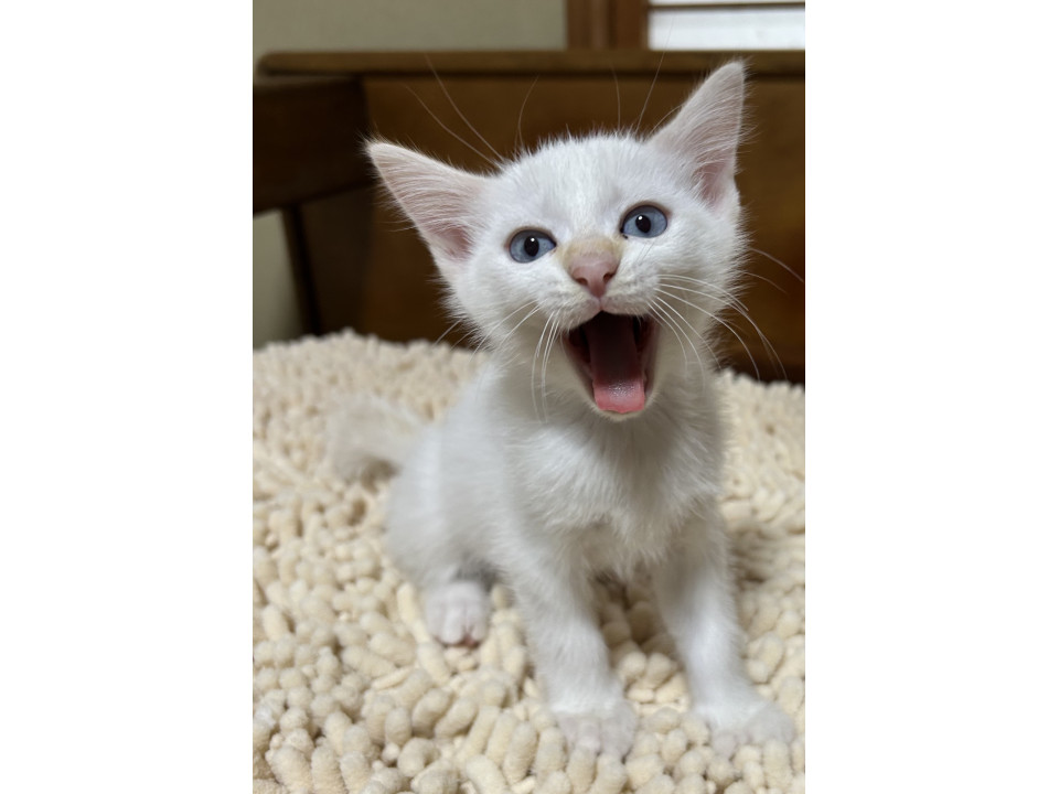 7頭の子猫が生まれ(室内で出産)、そのうちの4頭が白系統、キジ2頭、茶トラ1頭でしたが、白4頭は生まれたときは、皆真っ白でしたが、育つにつれて色味や柄に違いが出てきました。この個体は、白系統4頭の内、白の猫です。ただし、写真を注意深く観察すると薄い虎模様が一部入っているのかもしれません。他の白系統ネコ3頭は、耳に黒のアクセントがありますが、この猫は耳も白い。