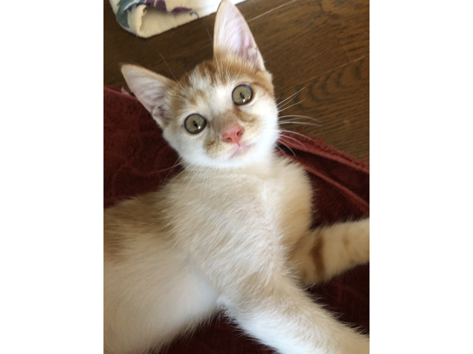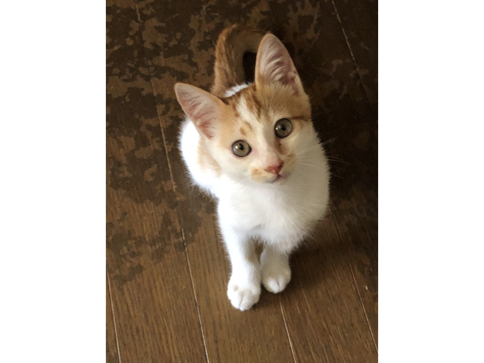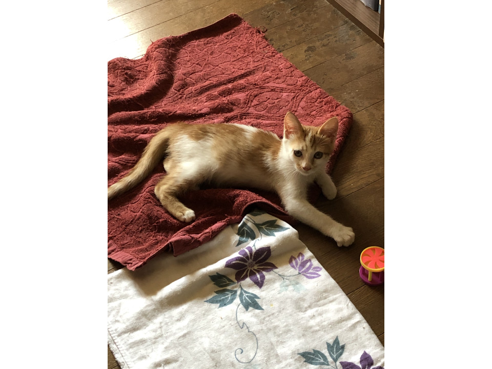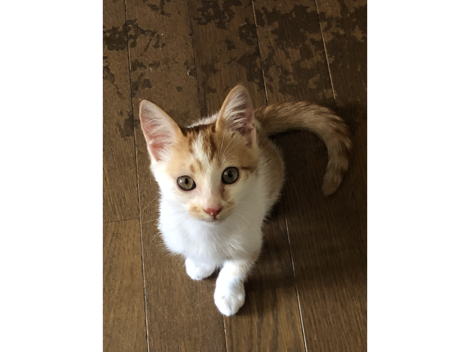 しっぽの長い、茶しろの男の子です。甘えん坊で傍から離れなず、ずっと近くにいて遊んだり、うたた寝したりしてます。