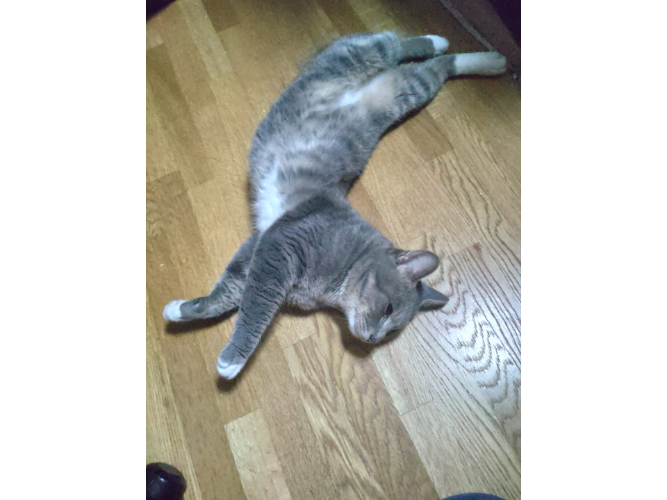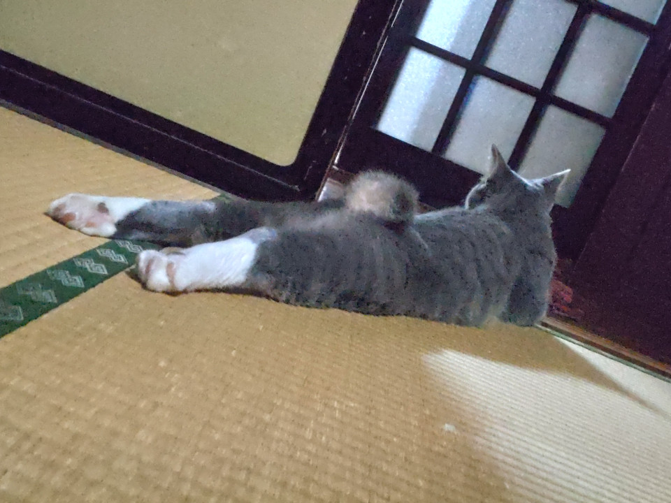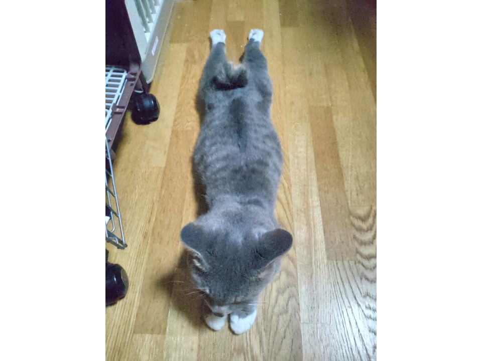 前脚短く後ろ脚長いという独特の骨格の為、楽な姿勢というのが普通の猫とちょっと違うようです。