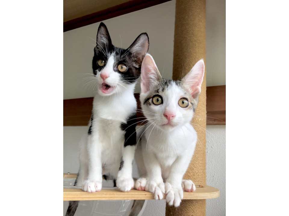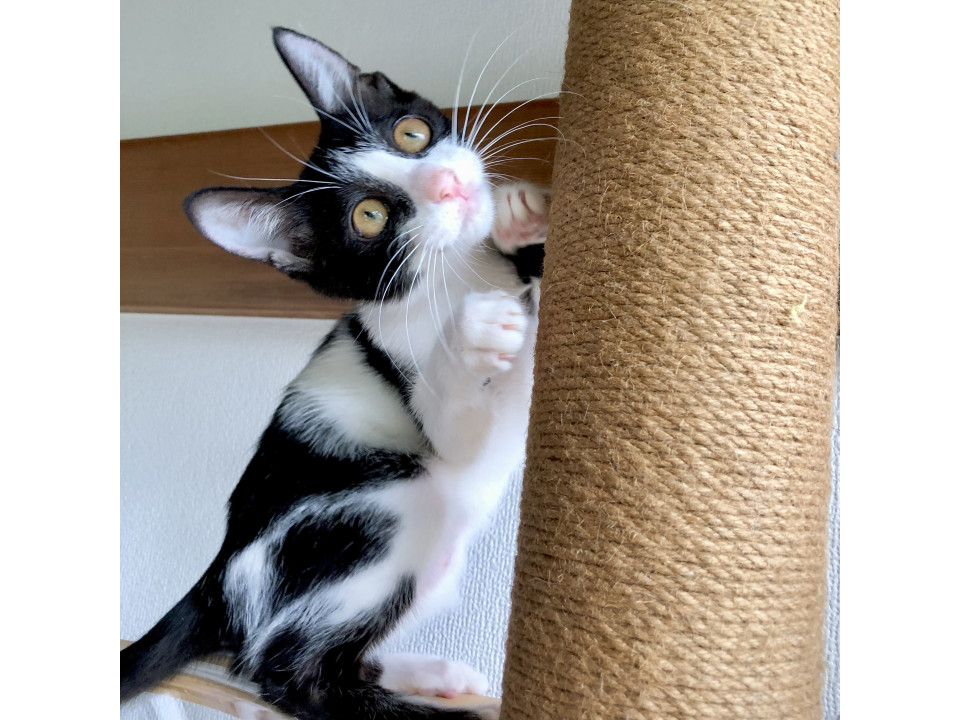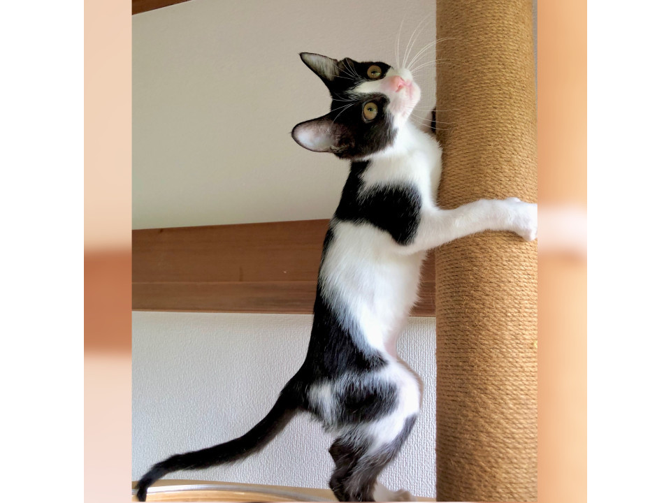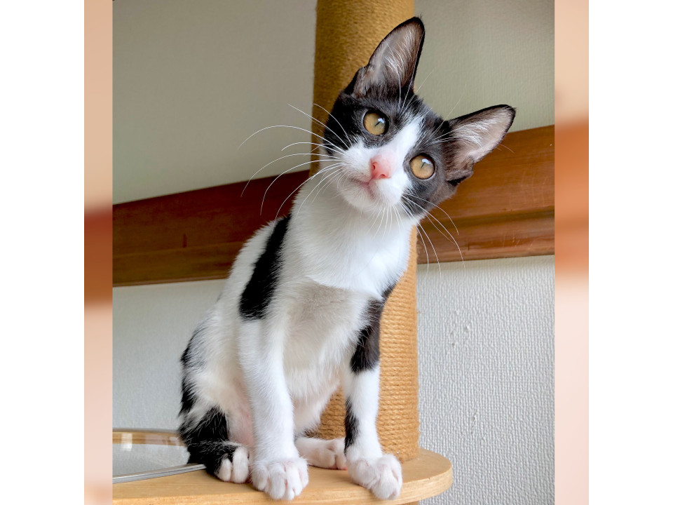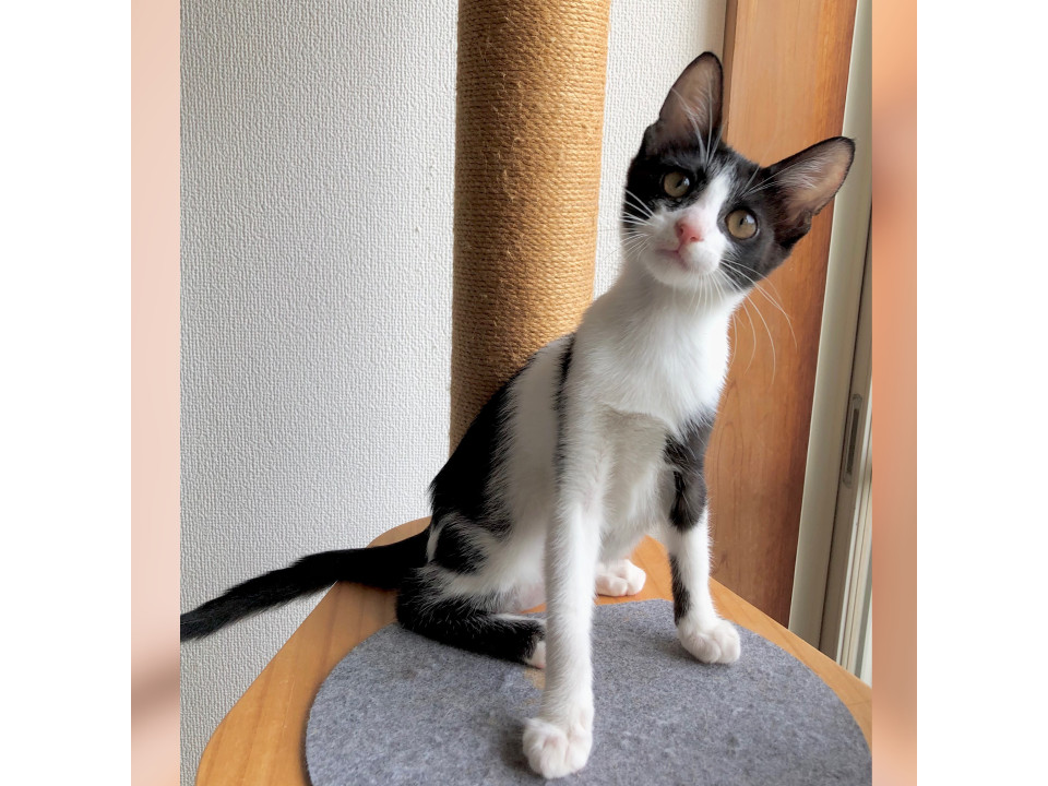 場所人見知りなく馴染みが抜群いいです。尻尾がスラリと長くスリム体型とのバランス、キレイなハチワレがとっても魅力的です♡子猫らしく活発なので仲良し兄妹のクルーラー君と一緒のお迎え歓迎です!先住さんがいらっしゃる環境も歓迎です!
