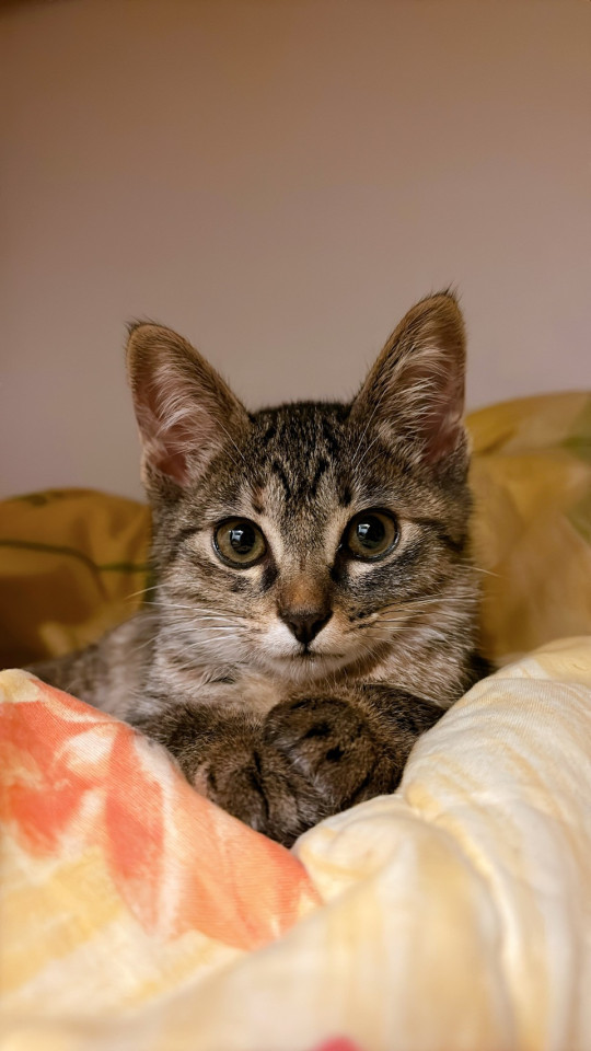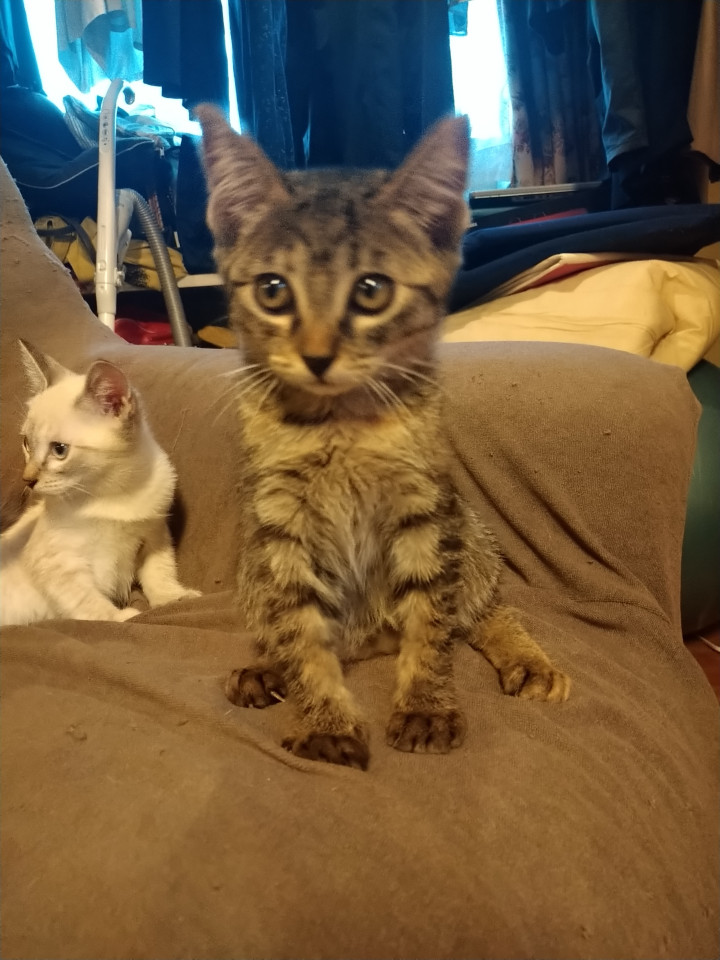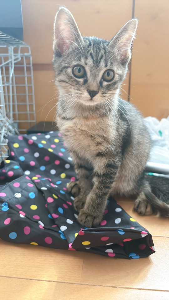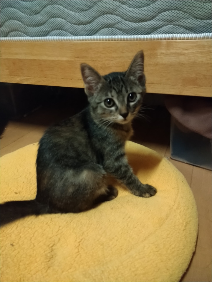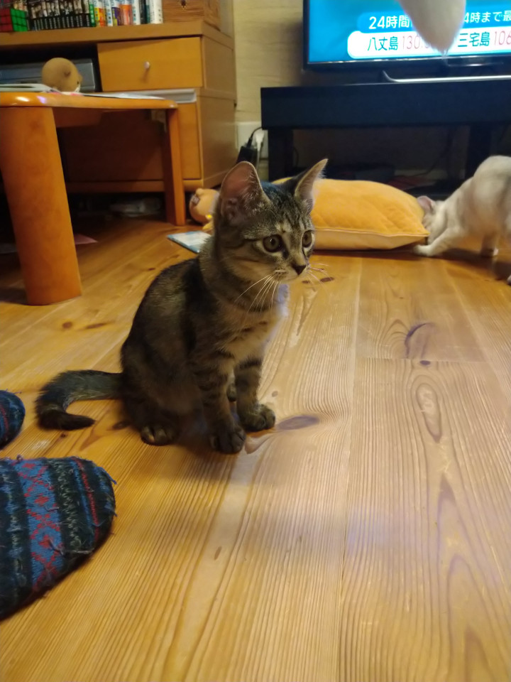 キジトラだと思いますが、所々茶色い毛が混ざっていて綺麗です。大人しくまだ人見知り気味ですが、遊び始めると元気にジャンプしています。