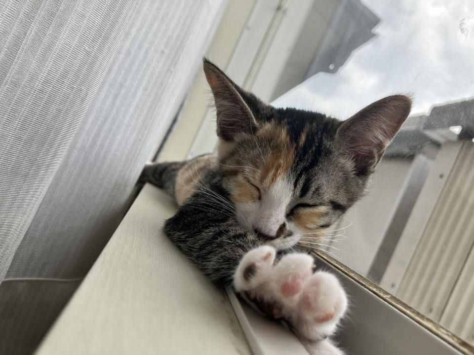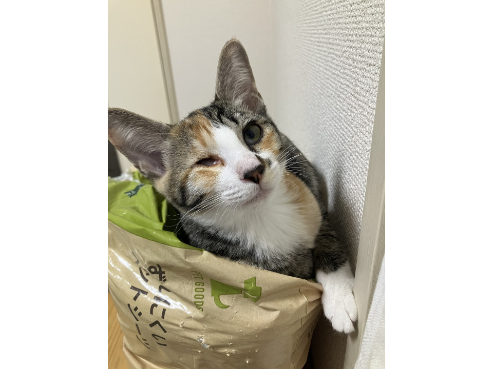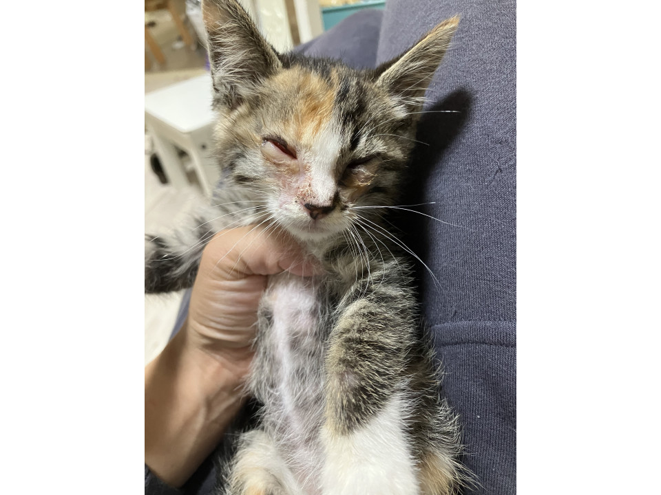 保護時(生後2.3か月位)に猫風邪をひどく引いており、両目が目やにで塞がっていました。