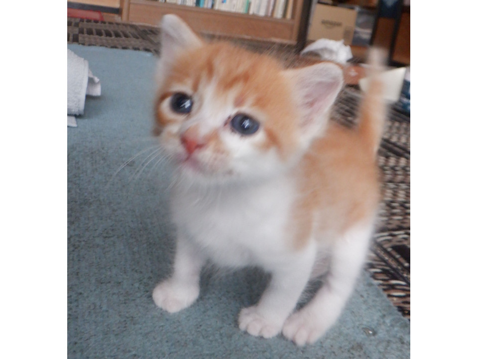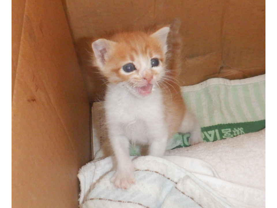 9/28家の軒下で子猫一匹だけになっていて騒いでいたので保護しました、生後2~3週間ぐらいでした、現在保護して1ヶ月ほどになります、以前4月に育児放棄された猫を保護し里親募集しましたが柄はほとんど同じ茶白で大きさも同じぐらいです。同じ母猫が育児放棄したのではないかと思います。実家と協力しながら面倒を見ていますが、こちらで飼うことはできないのでよろしくお願いします。