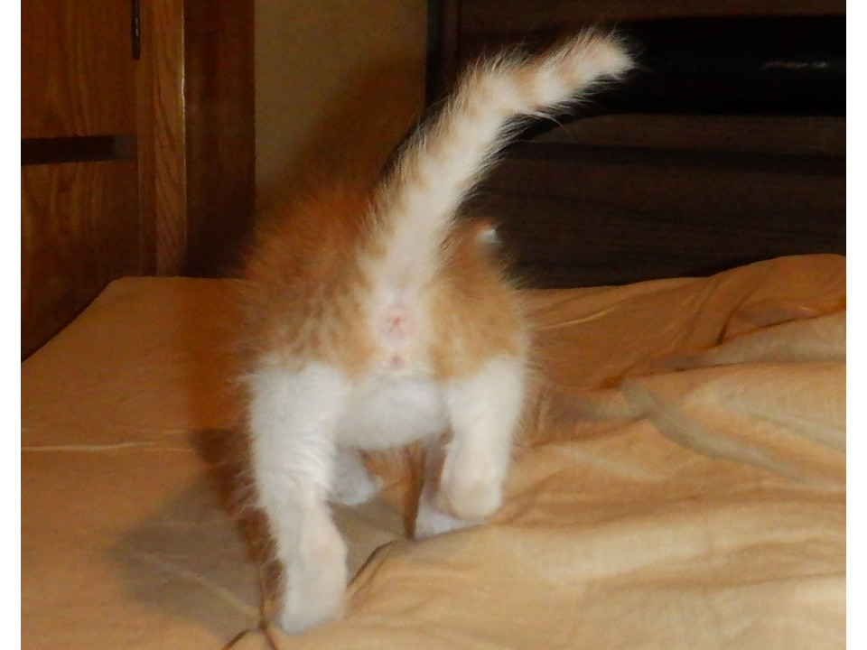 野良猫(雑種)、曲がり尻尾の茶白、女の子です。保護した日はシャーシャーしていましたが、今は人馴れしていてよく喉をゴロゴロさせています、元気な子で部屋を猛ダッシュしたり、足にまとわりついたり何でもオモチャにして遊んでいます。
