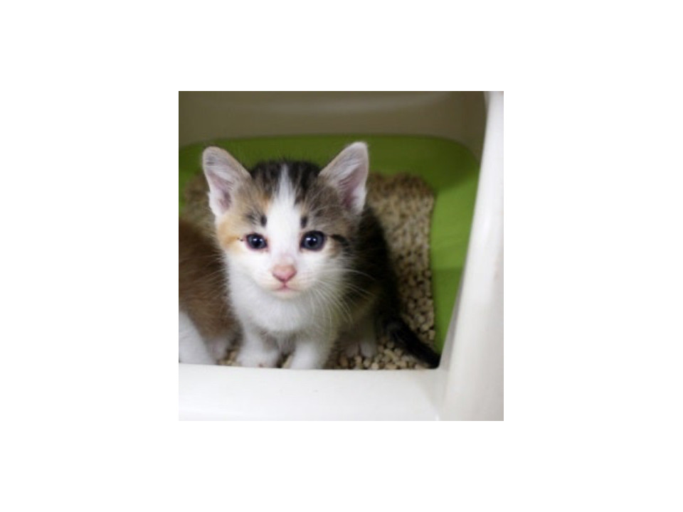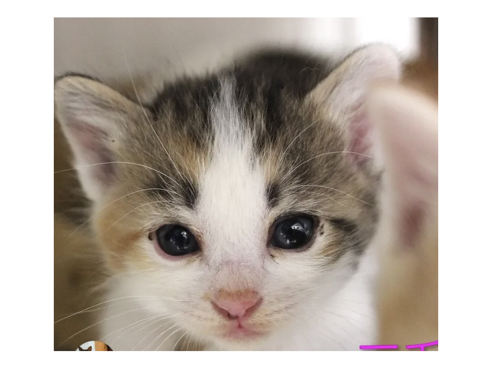 キトンブルーのお目目が美しいハチワレ三毛の子猫ちゃん。生後1ヶ月の女の子です。
