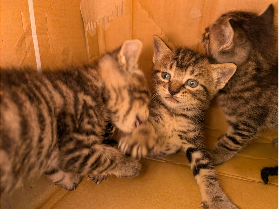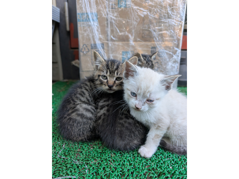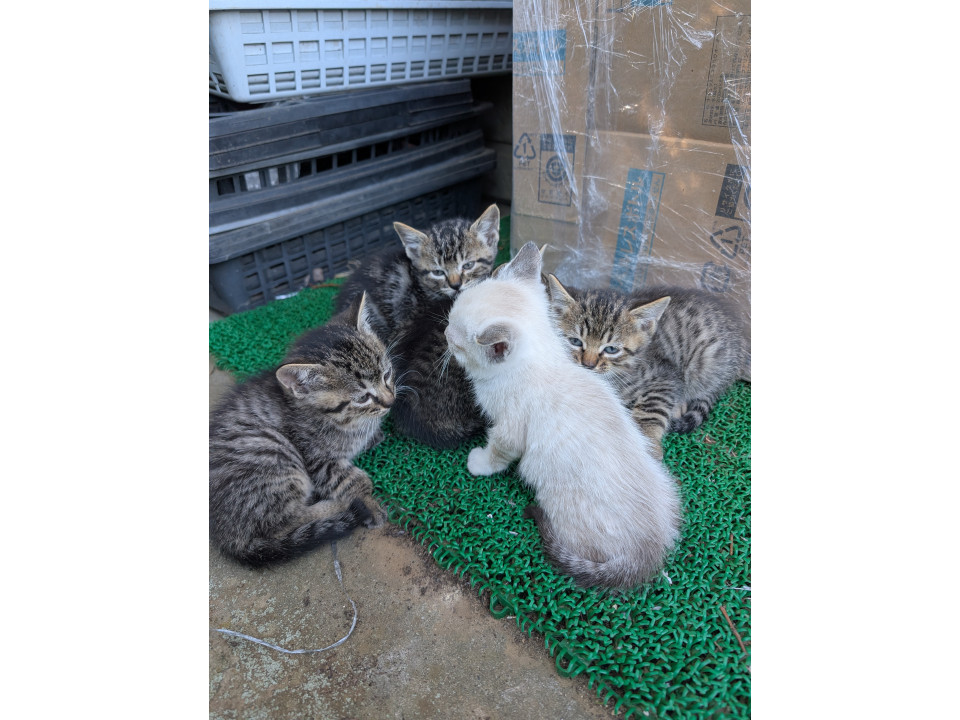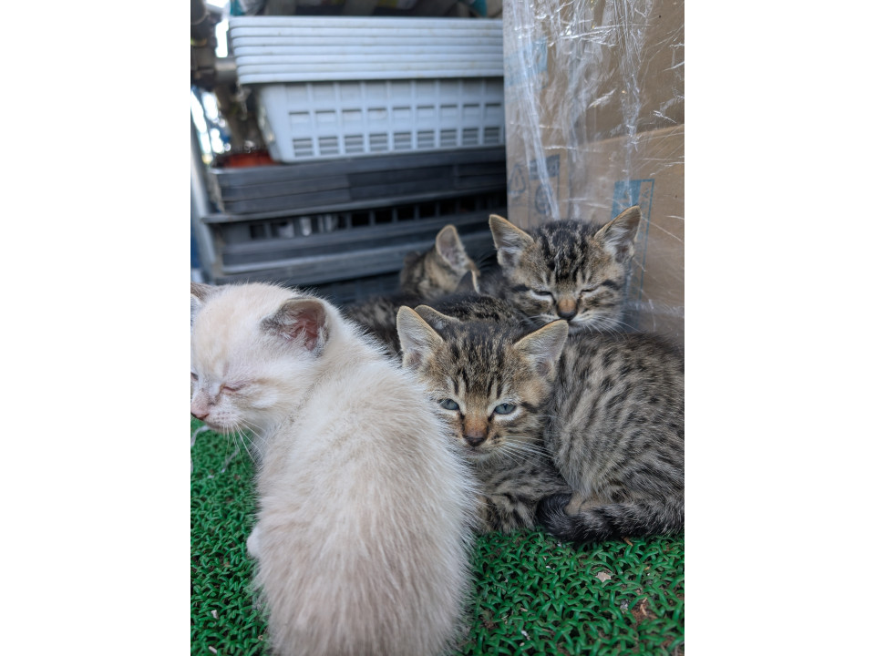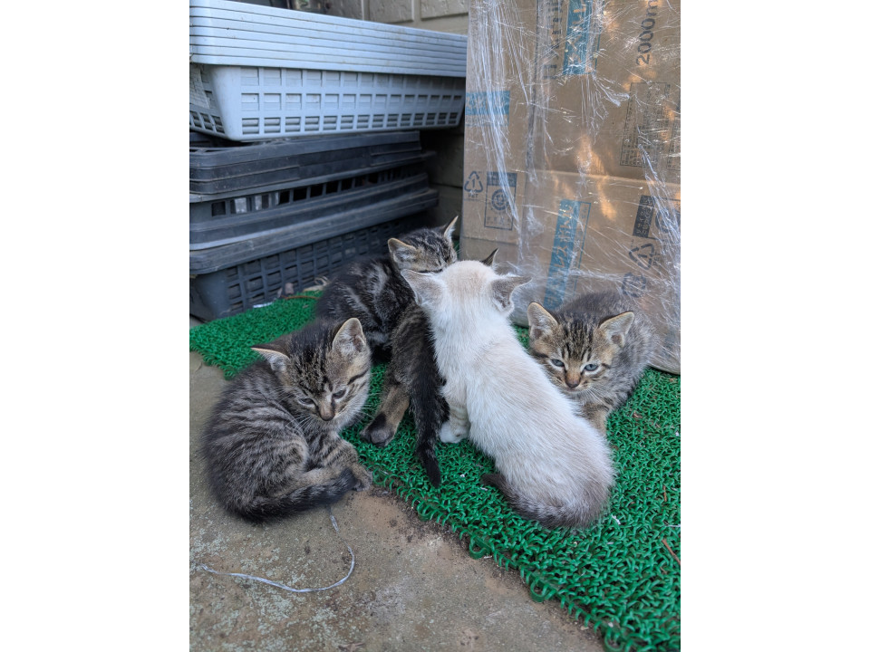 野良猫が駐車場の収穫かごに出産してしまい居座ってます。仕方ないので段ボールハウスを製作して玄関近くで育ててます我が家は既に先住猫が居ますので飼えません