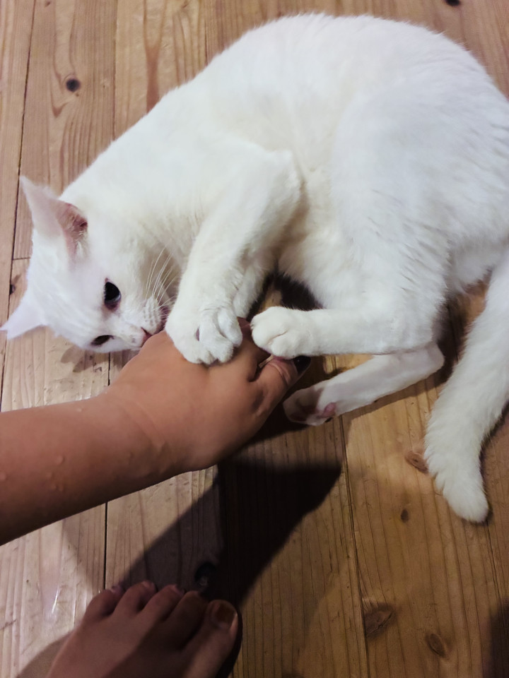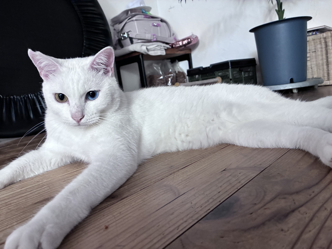 小声でハスキーボイスが特徴的です。好奇心旺盛、他の猫にも平気で寄っていきます。