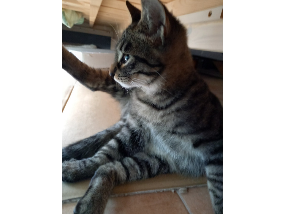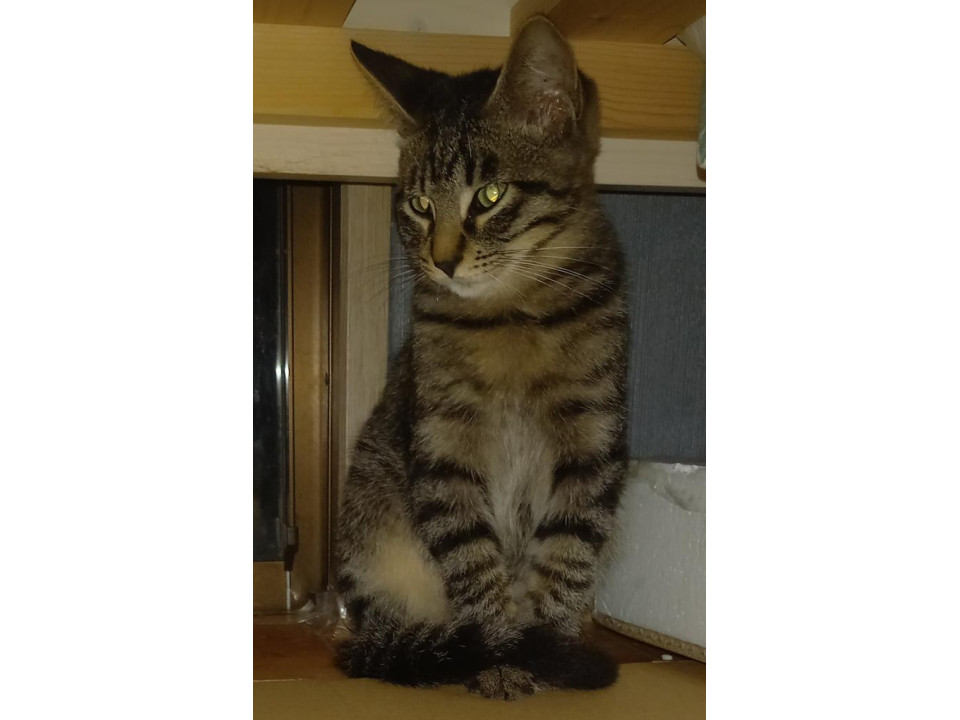 キジトラです。模様のブラックが強め。足がちょっと大きめのオス。体重2.4㎏