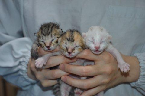 生後4日、野良の赤ちゃん3匹です。安楽死させる為、病院に持ち込まれました。現在、病院のスタッフが交代で夜中も哺乳しています。離乳頃までは、病院で面倒を見てくれるそうですが、多忙期の為、長くは無理とのことで、急遽、里親さまを探す事となりました。赤ちゃん猫の飼育経験ある方でしたら、心強いです。6/17追記:目が開きました!