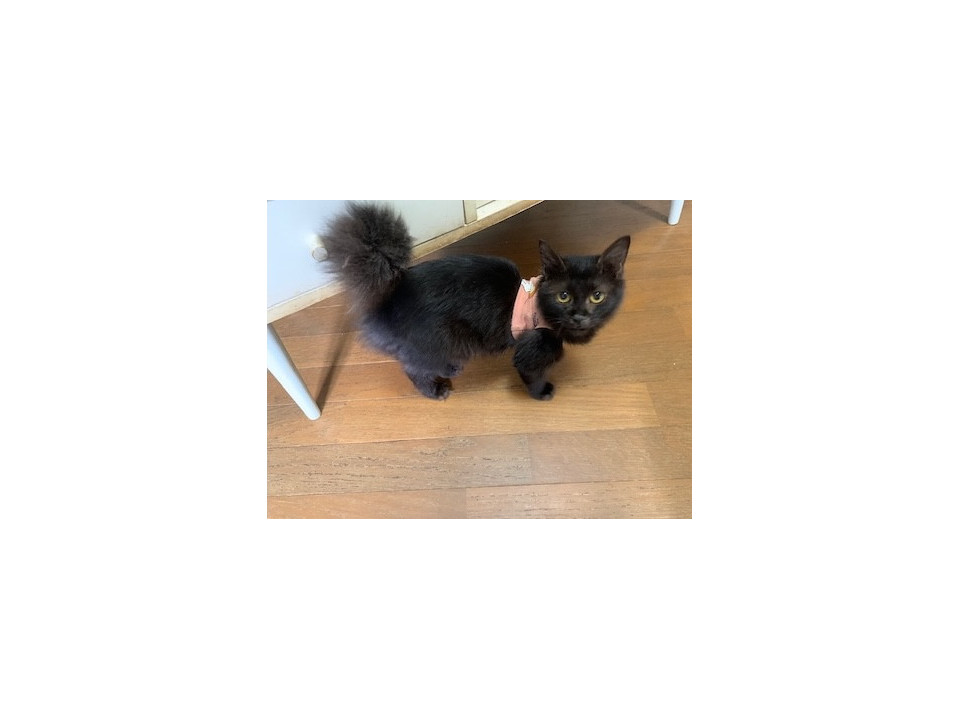 可愛い黒猫、若葉ちゃんです。もふもふのぬいぐるみのような可愛さです、このファッサファサな尻尾を見てやってください。
