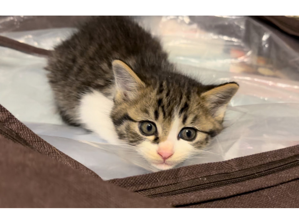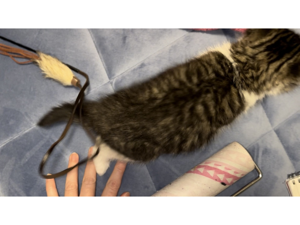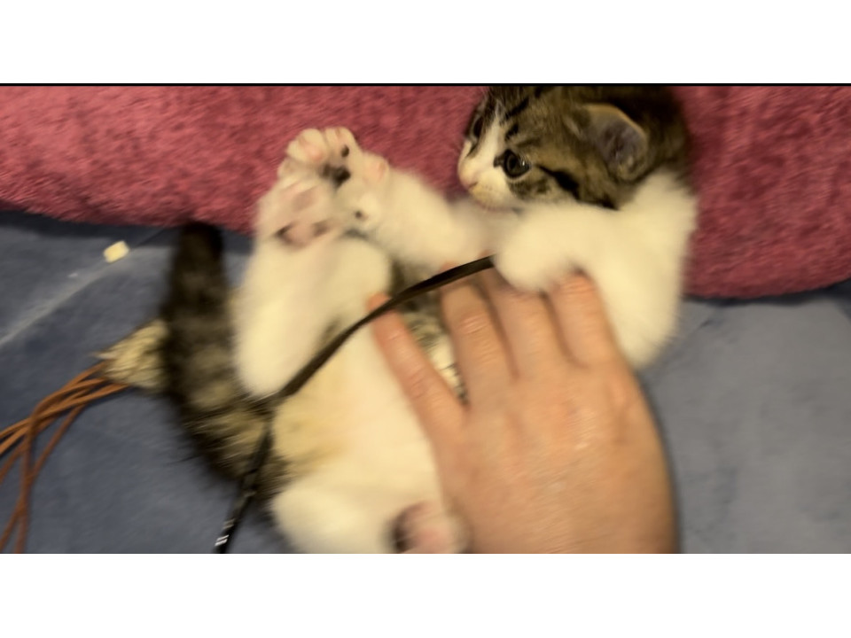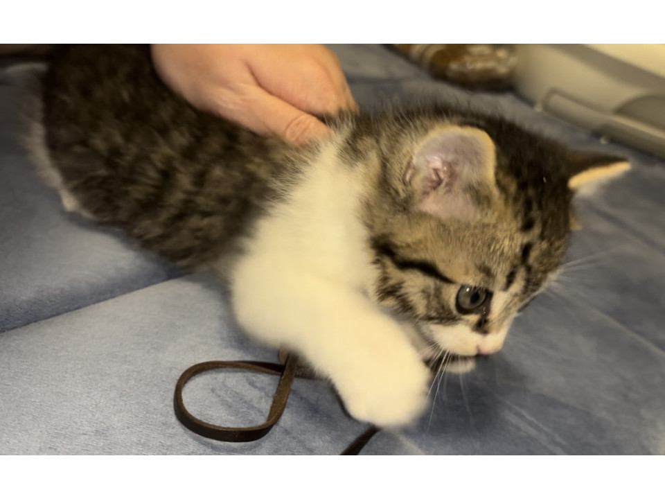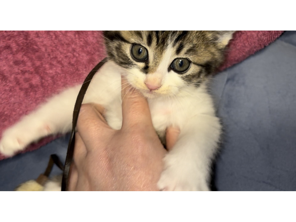 幼いとき特有の青い目をしていますが、母猫にベッタリというよりも遊ぶことが楽しいようです