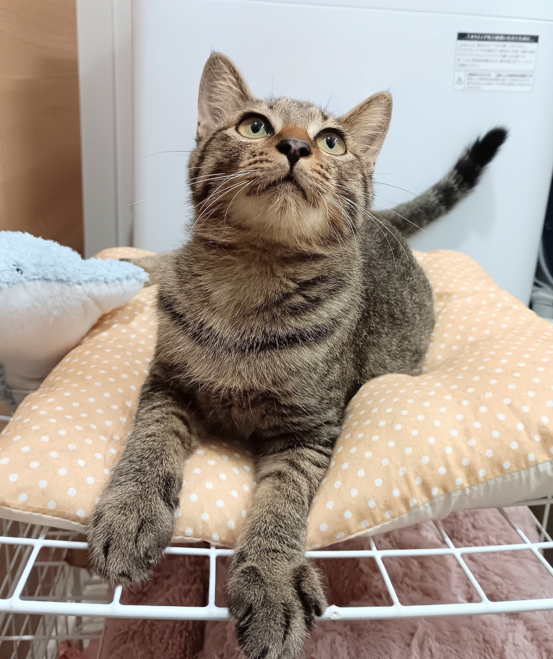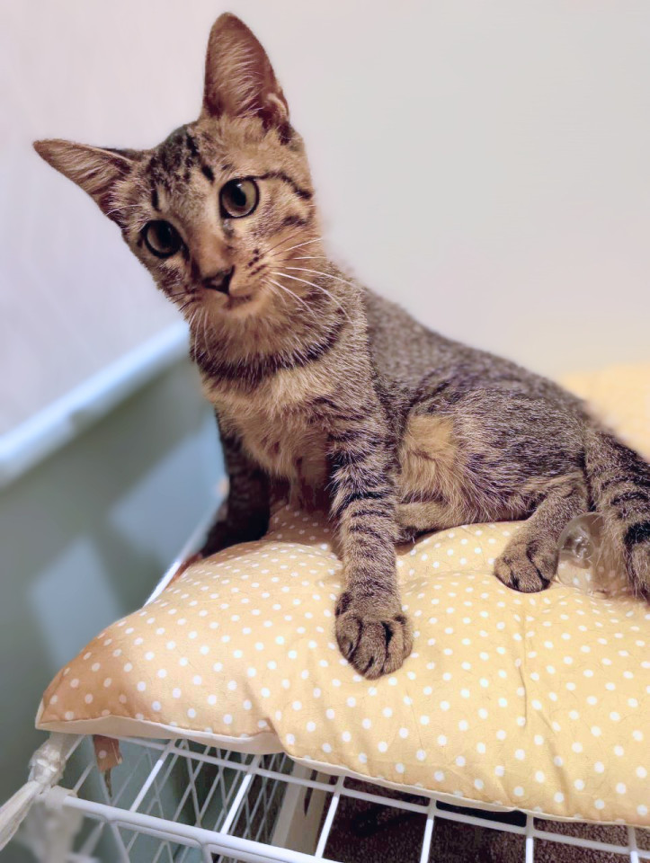 綺麗なキジの女の子。女の子にしてはおおらかな感じです。オスの子猫二匹と同じ部屋で暮らしていますが、オスたちのじゃれあいが激しいときは、離れてそっと見ている感じです。人が大好きで目が合うだけでぱっちりと挨拶してくれます。