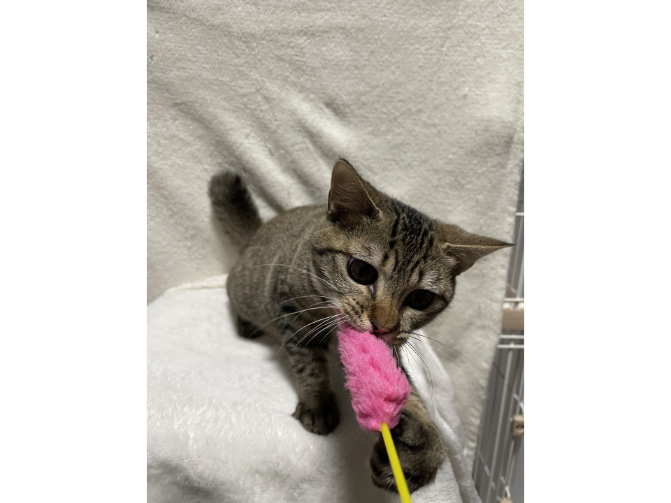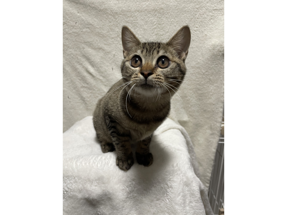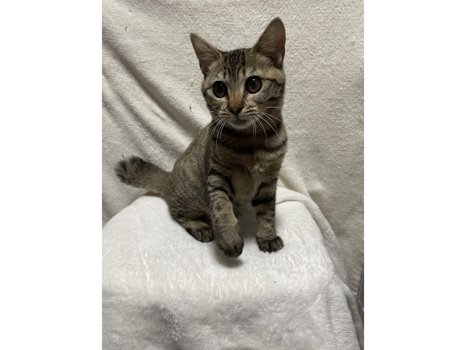 目がクリクリしたキジトラの女の子で尻尾は少し短めです