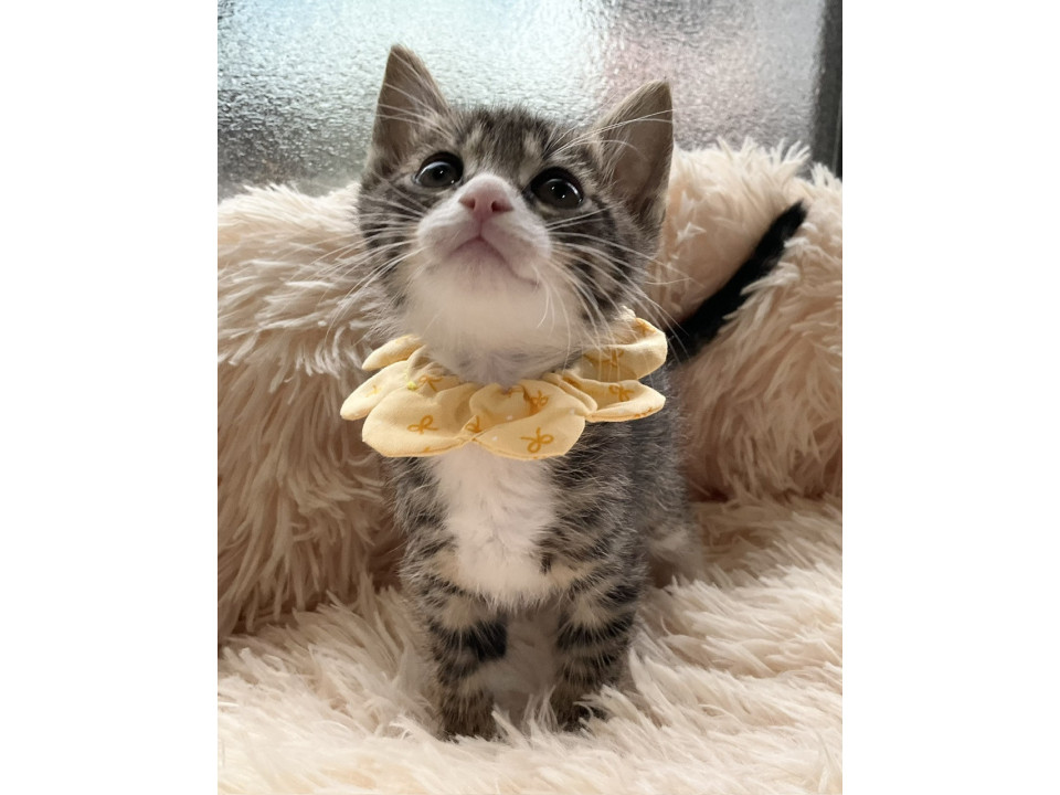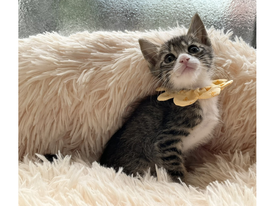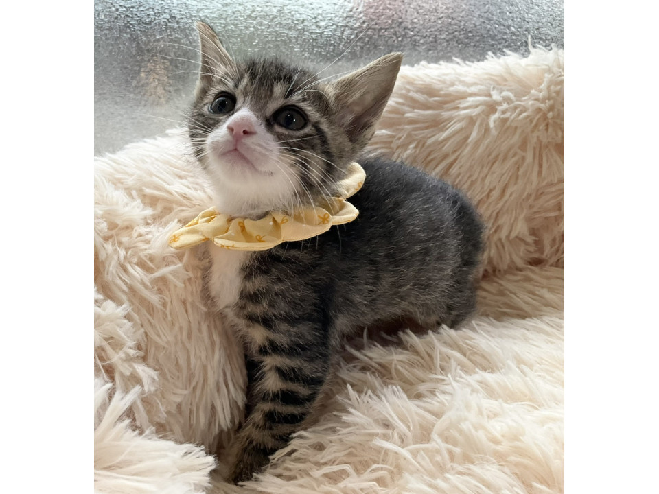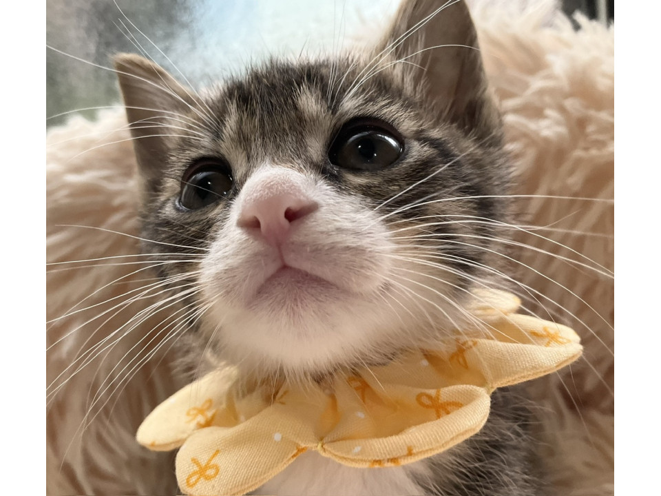 ぱっちりとつぶらな瞳と大きなお耳が印象的な、美しいキジ白の男の子です。