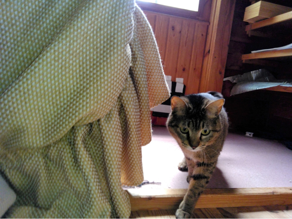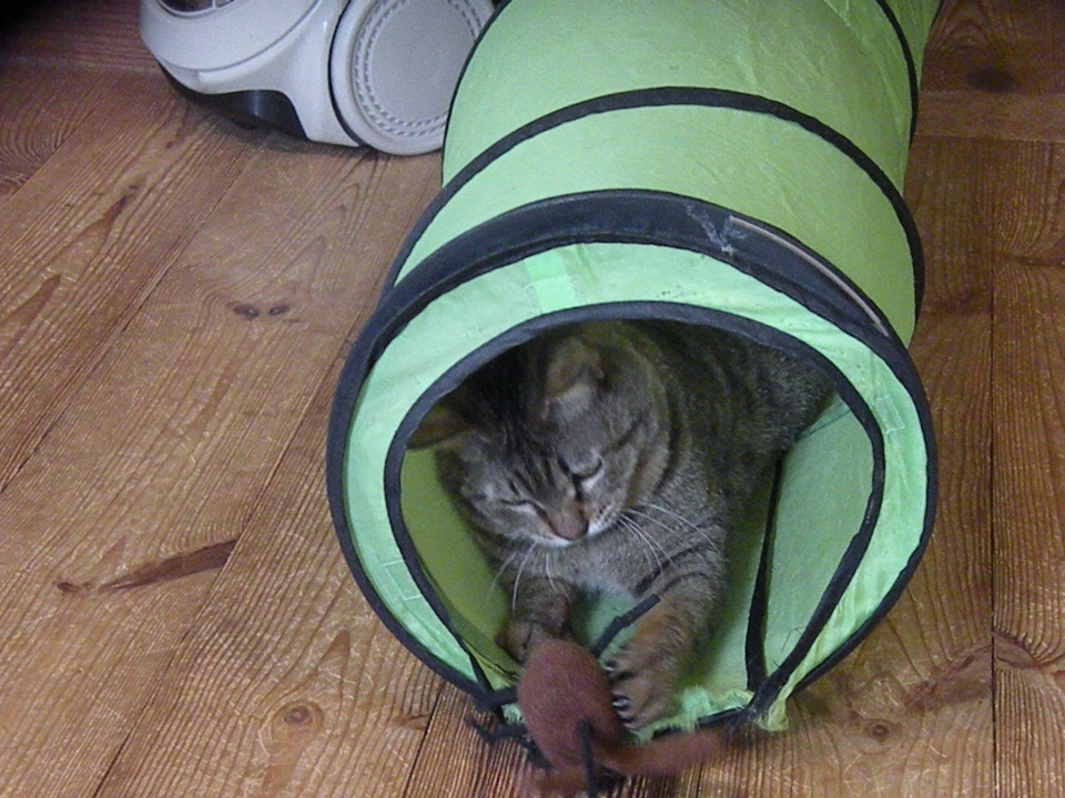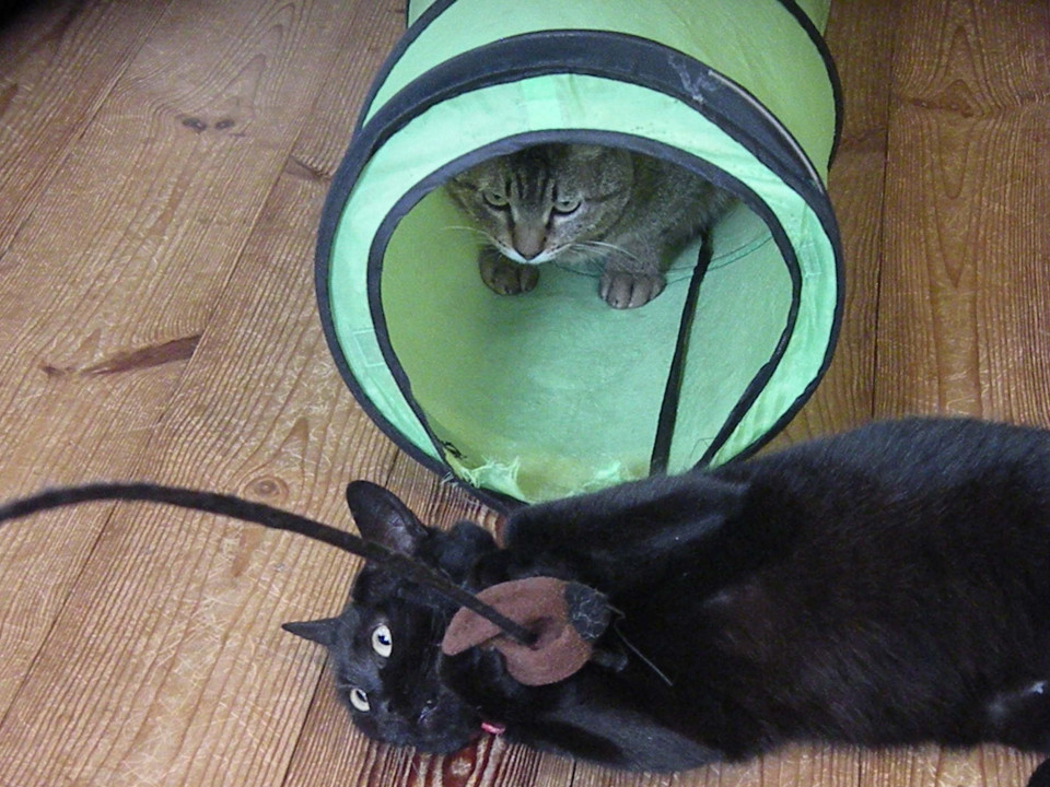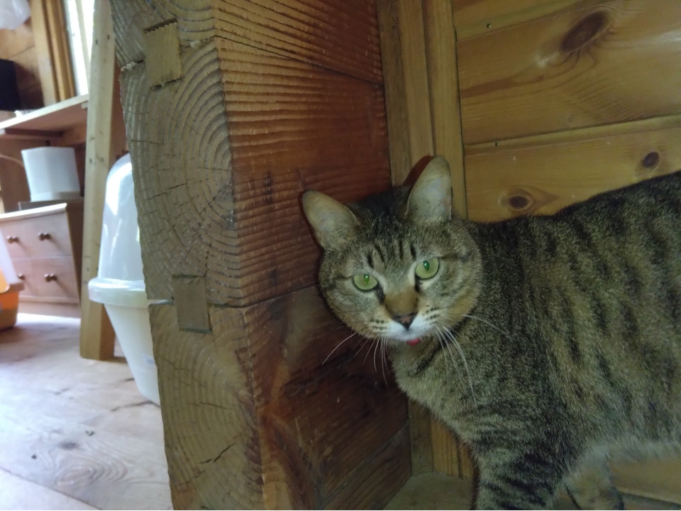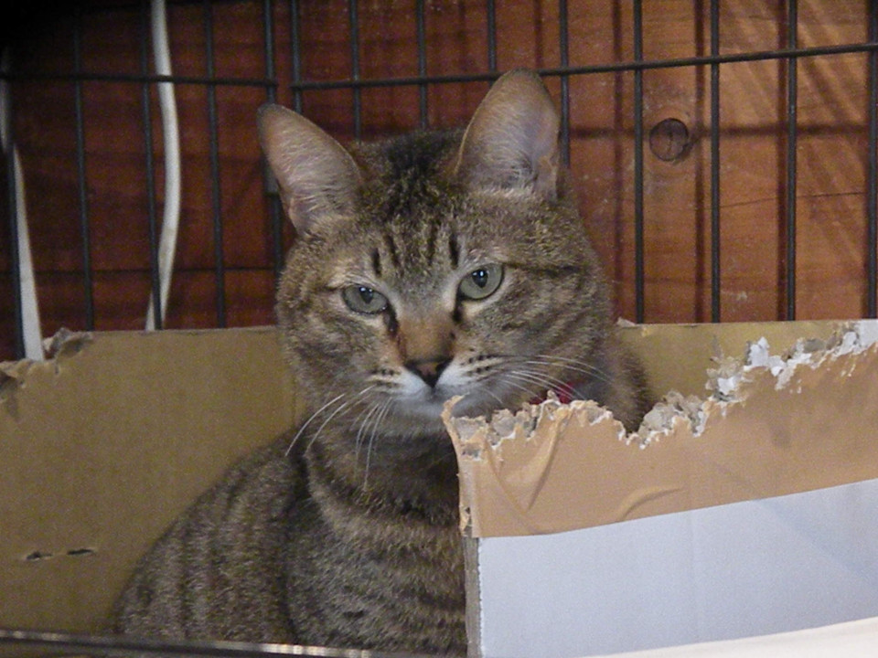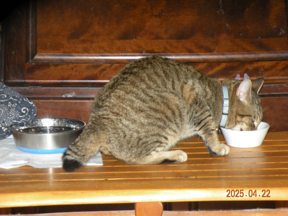 深夜、地域猫に給餌中に見かけ、即保護。この時点で推定生後5か月くらい。保護した近くで前日保護したクーちゃんとケージを並べて隔離。最初から仲が良く、2頭ともおっとりとした性格で、姉妹で遺棄された模様。