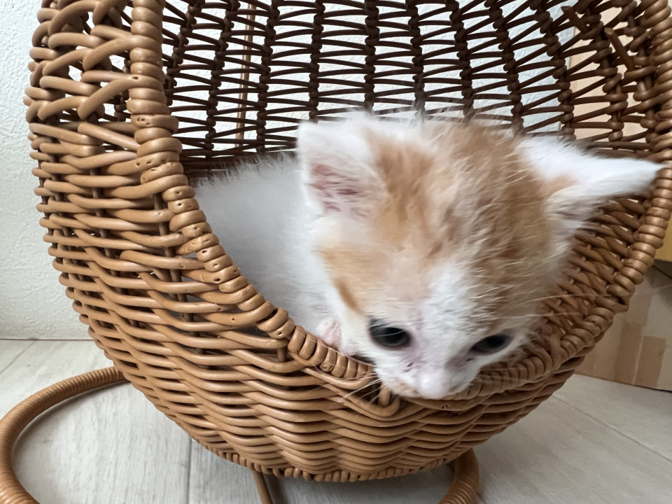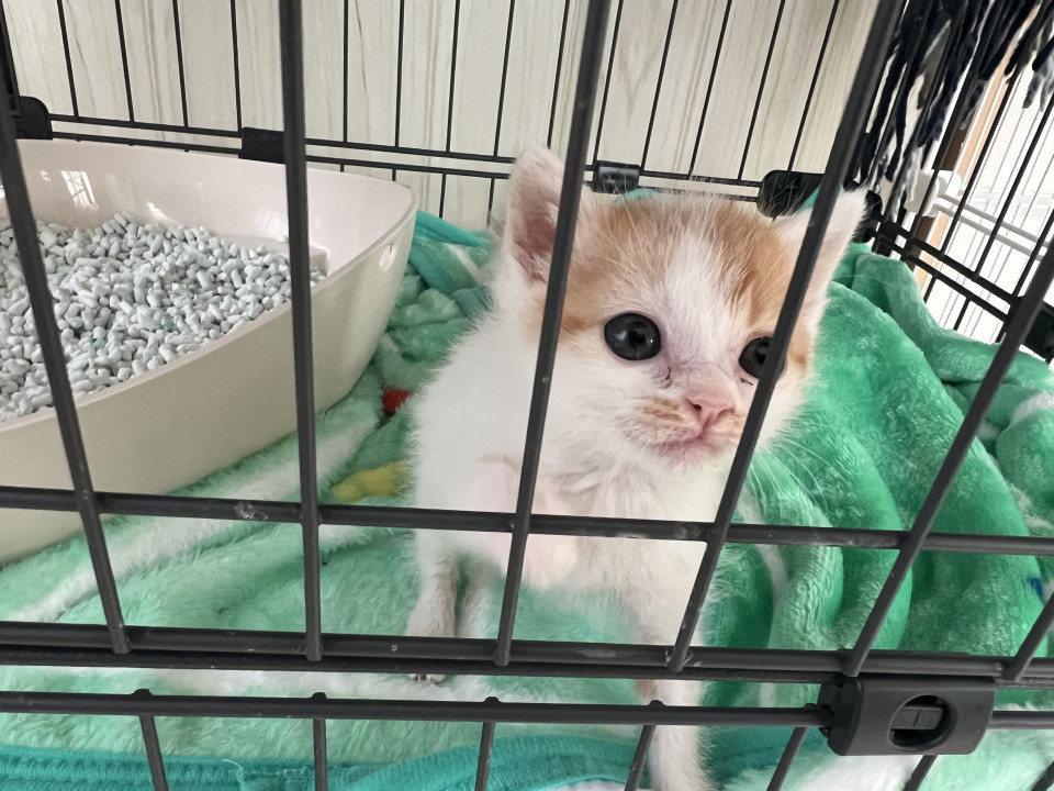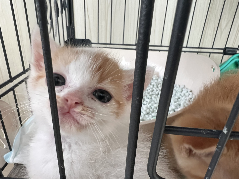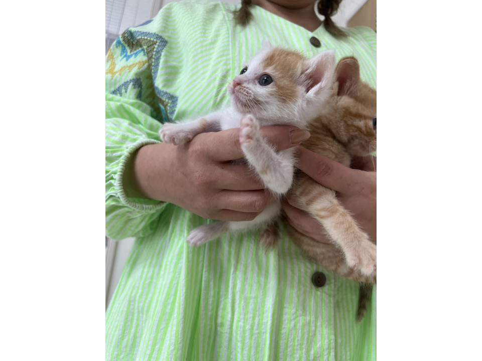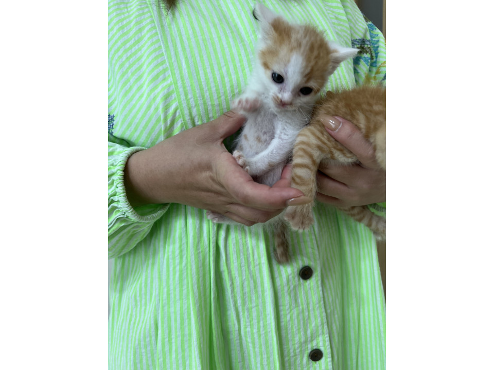 茶白の女の子、まだ小さいので性格までは分かりませんが、近い月齢の子と元気にじゃれてます。