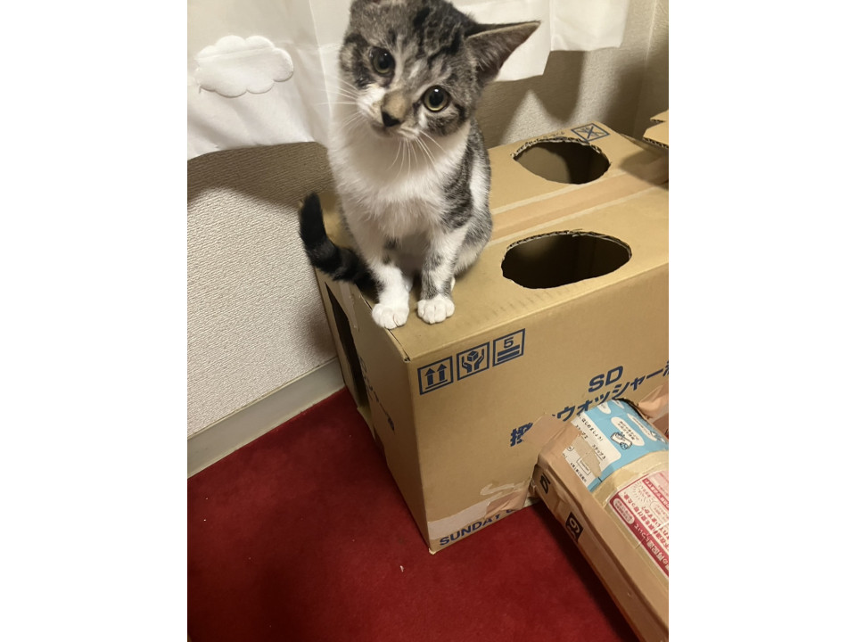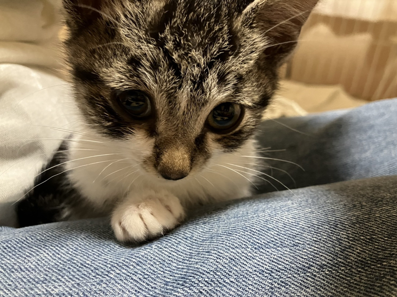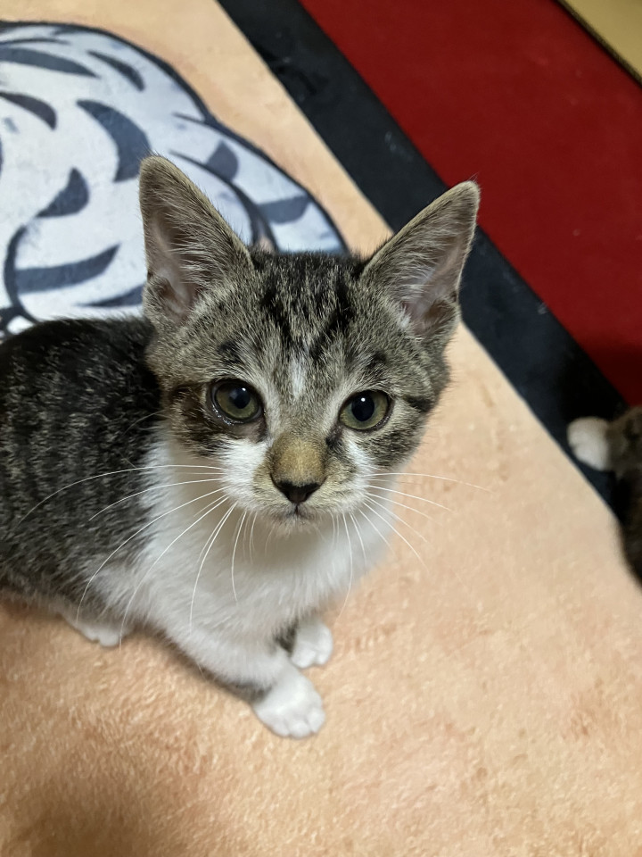 人がそばにいると安心するようで、膝の上にちょこんと乗って、そのまま気持ちよさそうに眠ってしまいます。体は少し小柄ですが、元気いっぱい!兄弟猫とコロコロ転がりながら毎日楽しく遊んでいます。よく食べて、よく寝て、遊ぶときは全力。見ているだけで笑顔になるような、明るい子です。