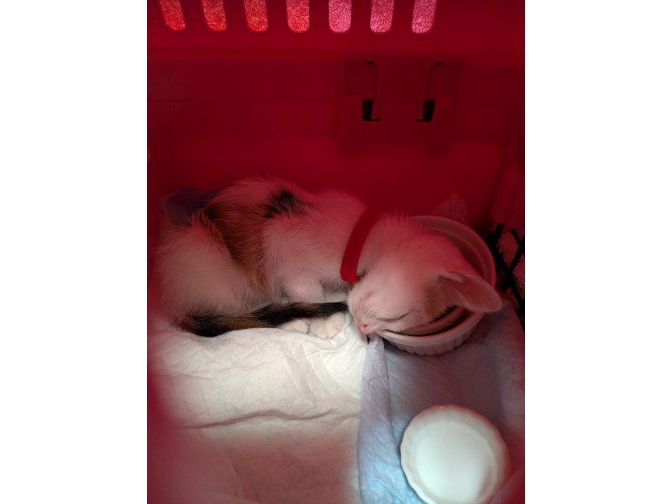 兄妹達と一緒の時には、体調が悪く食べられていなかったので、1匹になったら、餌皿に頭を入れて眠っていました。
