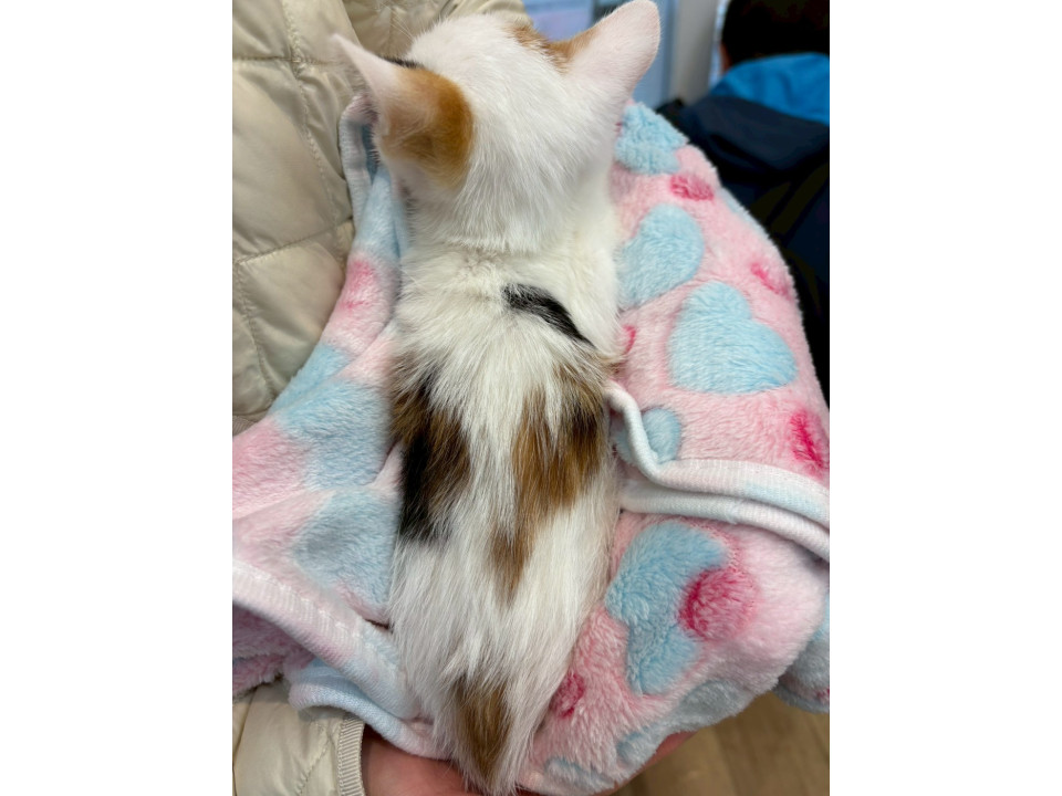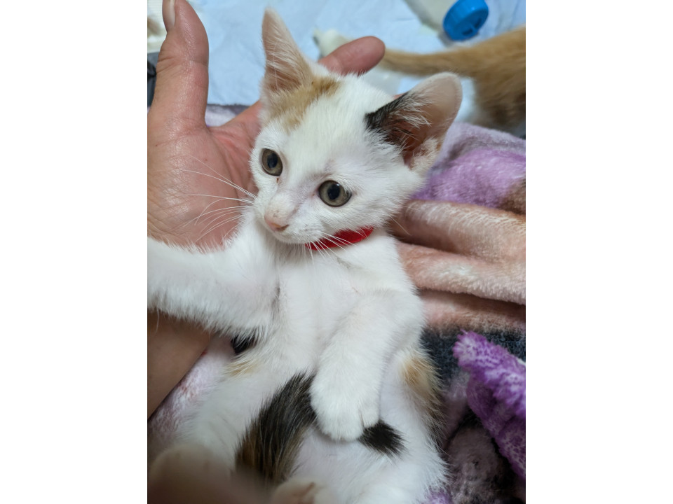 人馴れをしてくれて、鳴いて呼んだり、前足でチョンチョンしてきます。抱っこ好きで、膝の上で、お腹を見せて、顎からお腹までを、ナデナデが大好き♥️可愛い白三毛猫です。