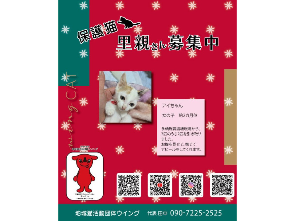 ここは質問欄です。応募の意思がある場合は「この猫ちゃんに応募」からお願いします。