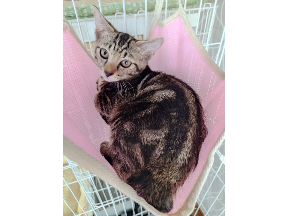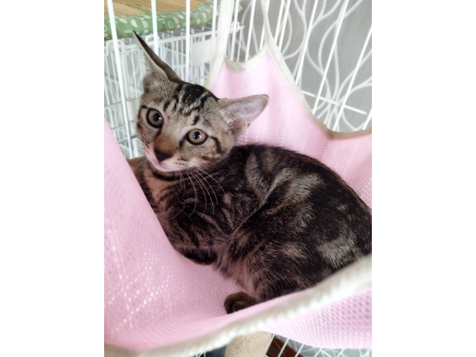 キレイなマーブル模様のキジトラの女の子。少しビビリですが、撫でられるの好きでゴロゴロ言います。抱っこも🆗少し、あじゃのペースでお願い出来ればと思います。あさと、うえまの兄妹です。