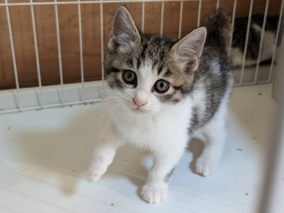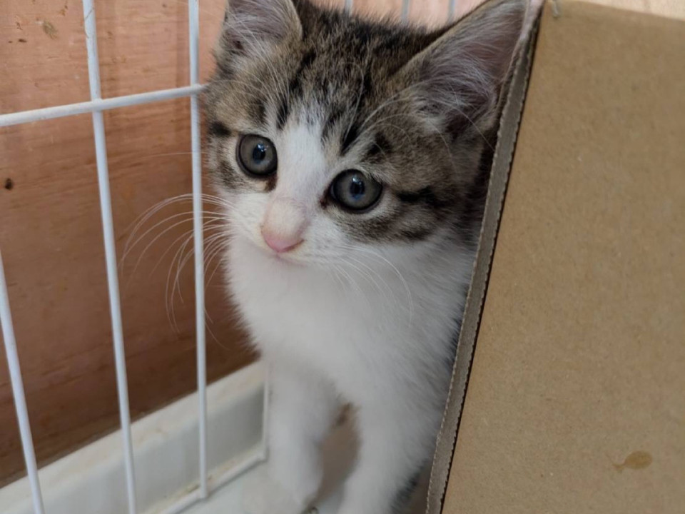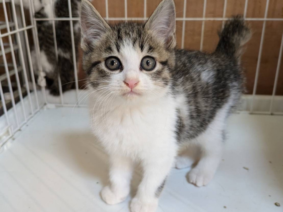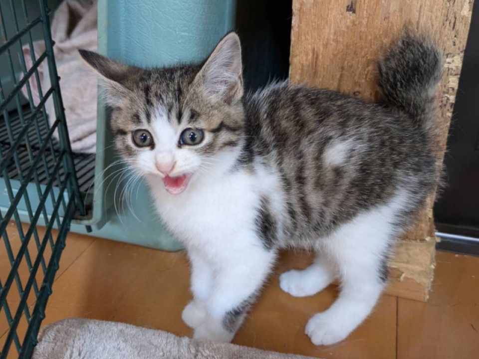保護したばかりですが元気で、3兄妹で仲良く過ごしています。短めのシッポも可愛い正統派美猫!