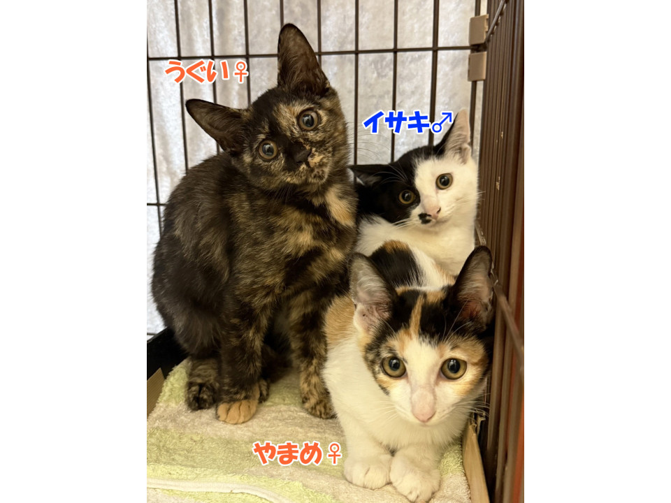 お父さん猫、お母さん猫はTNR予定で、仔猫は全員保護予定ですが、現在3匹の仔猫(イサキ♂、うぐい♀、やまめ♀)を保護。