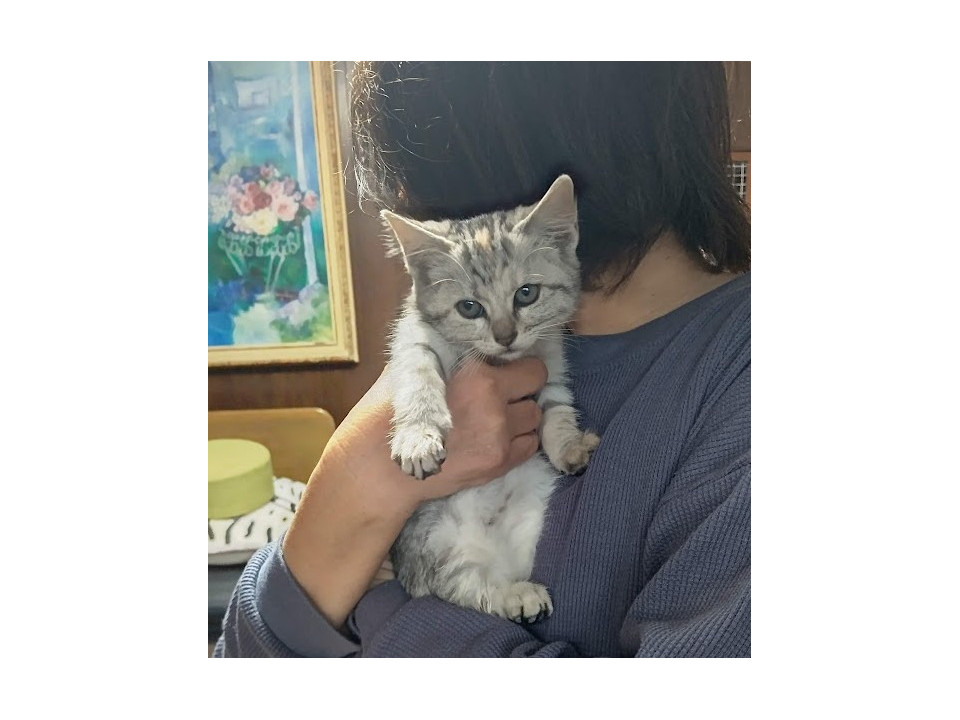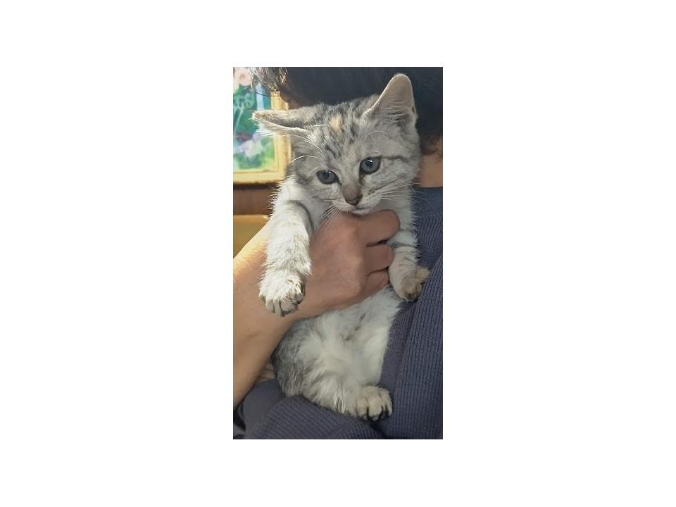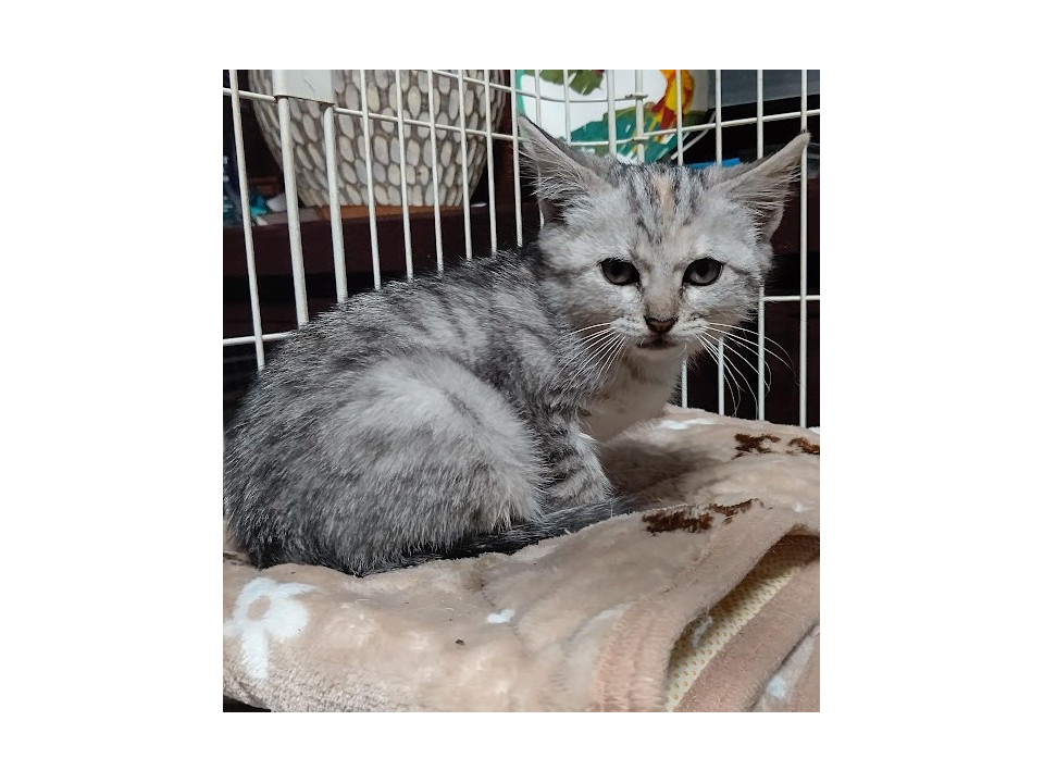 毛色・柄: 優しい色合いのシルバータビーです。まだ小さい体ですが、美しい毛並みと柄が際立っています。