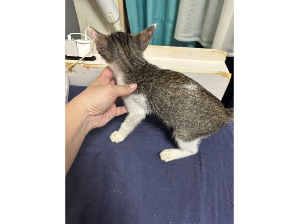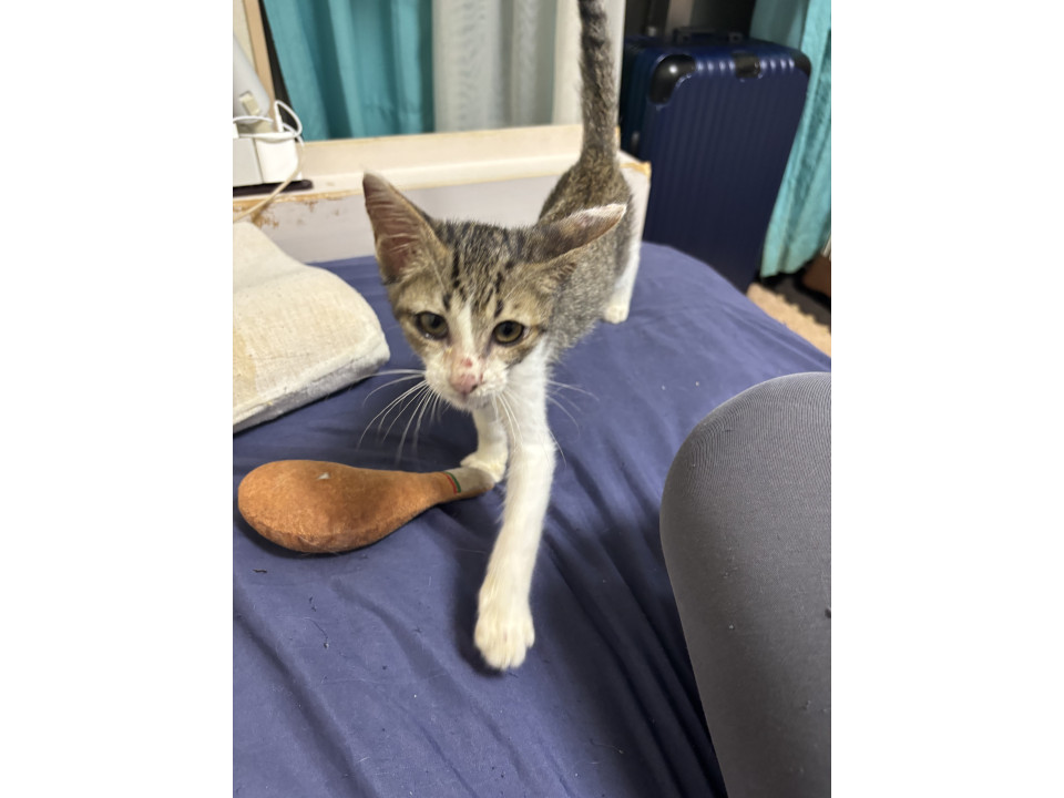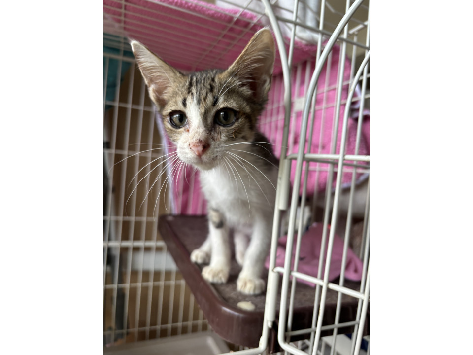 友人宅の敷地内に現れたのですが、とてもガリガリで目やになどもあり、元気がないことから保護。初期医療にかけながら親猫や飼い主さんを探しましたが現れず、里親募集をすることにしました。