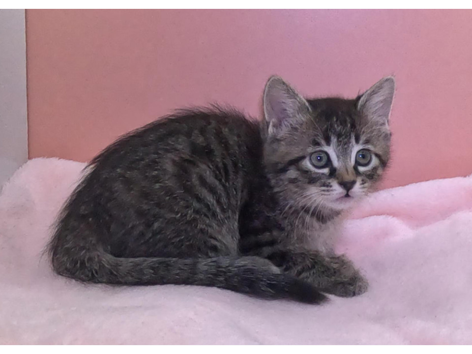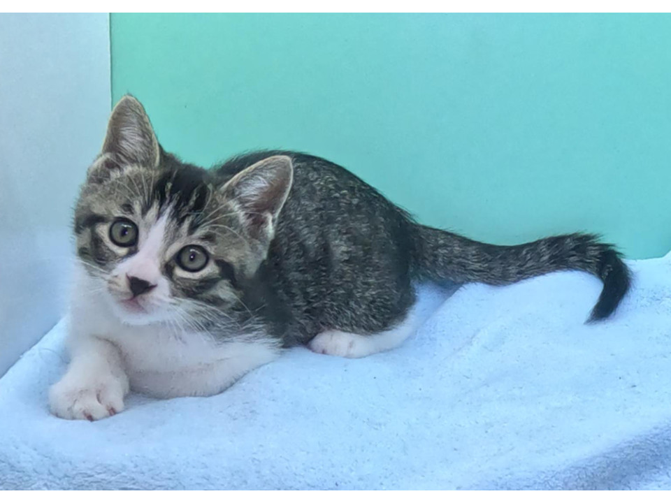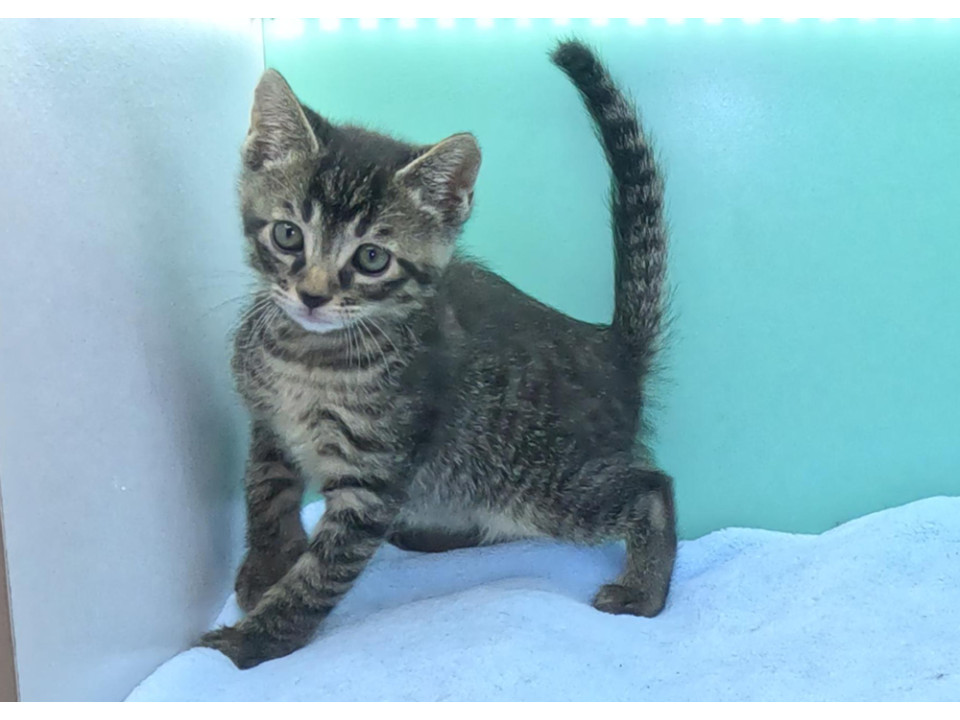 キジトラ♀ヴィーナスちゃん 尾長:利発でお転婆さん。お膝の上大好きなベタベタの甘ったれ、保護時に後左足脛骨を骨折しておりましたが、完治しております。