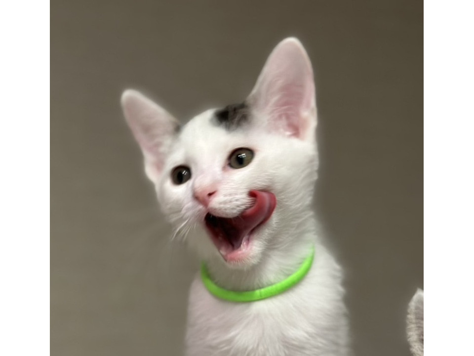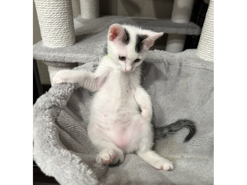 頭に黒ポッチと尻尾が黒の白が多めの白黒です。