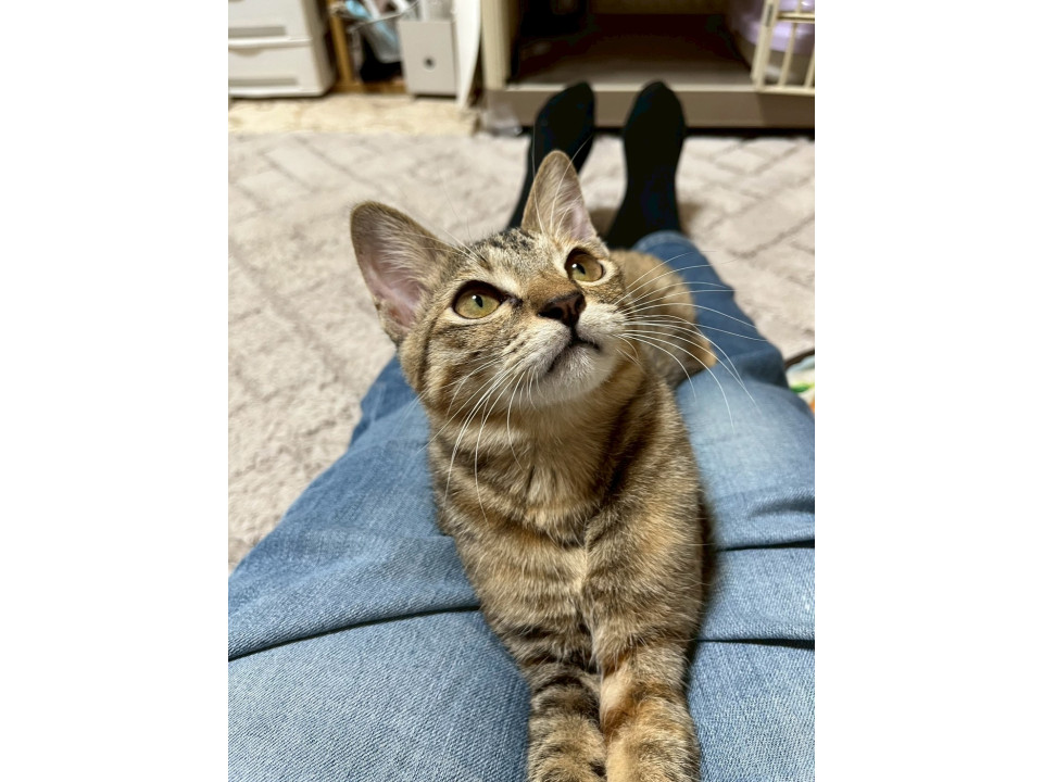 目が合うと鳴いて駆け寄り、すぐにお膝に!