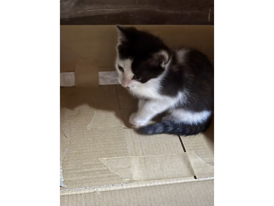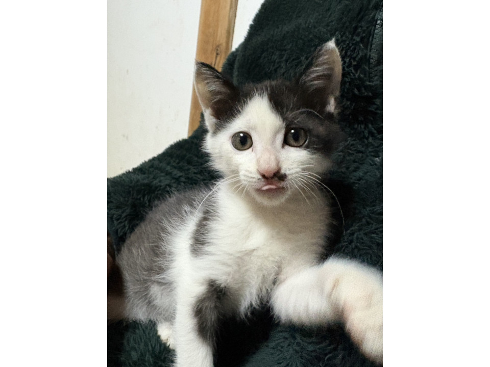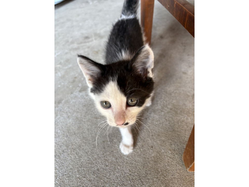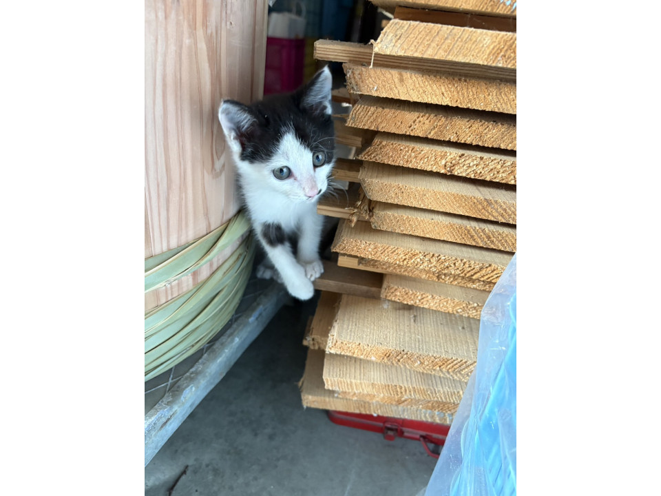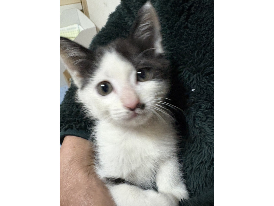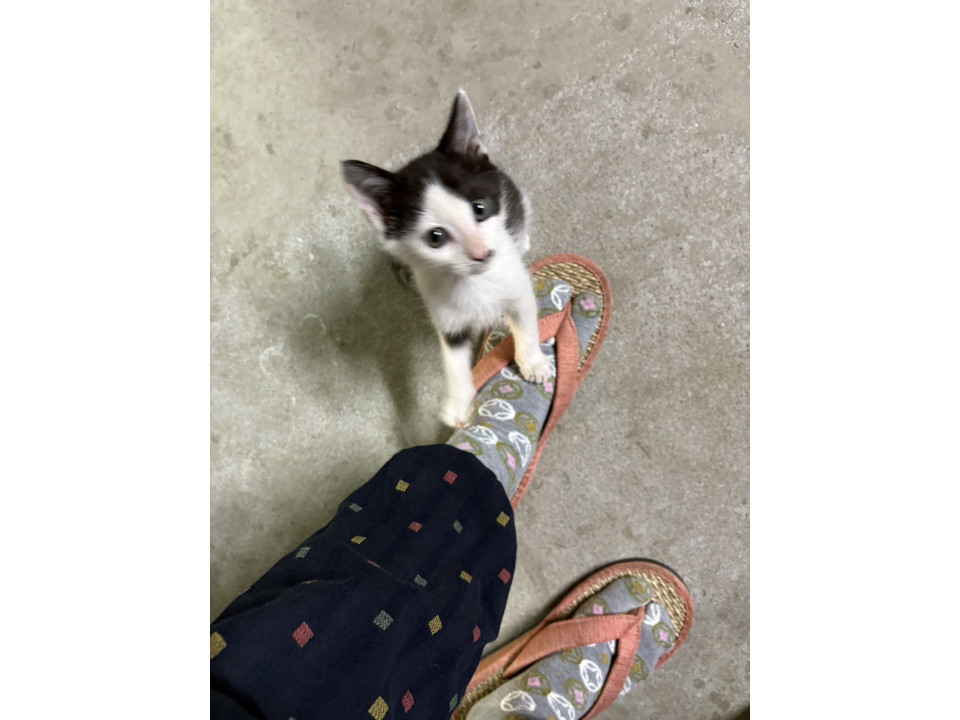 白黒の子猫で、鼻の下にほくろのような模様があります。うるうるした目が愛らしく、人間が大好きです。先住猫とも仲良く遊んでいて、かくれんぼをしたり、元気に飛び回っています。