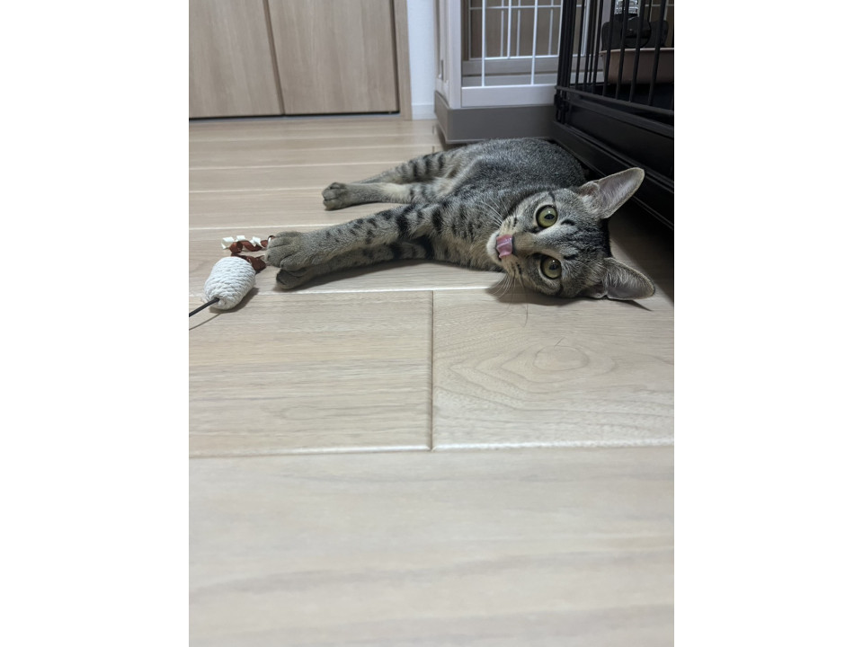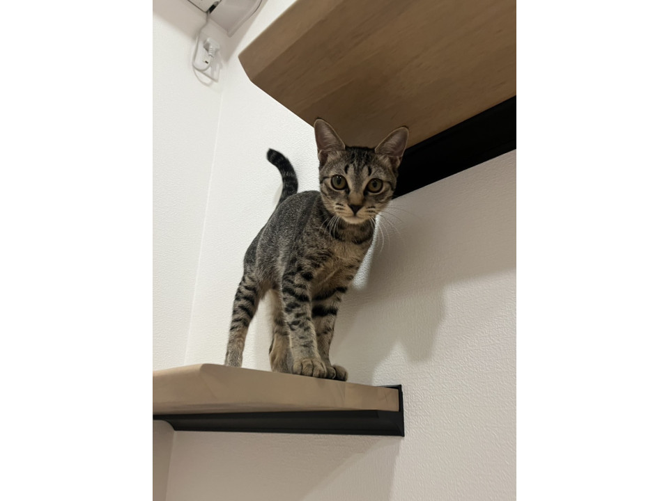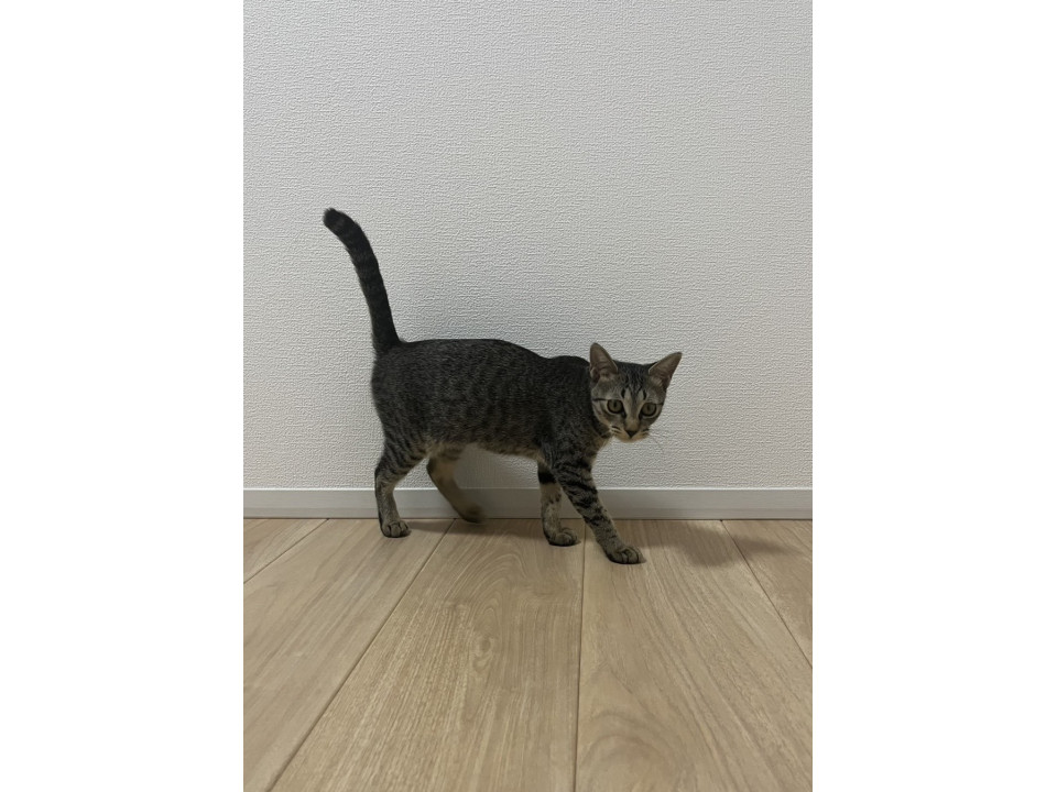 ○生後5ヶ月くらい(2025年11月中旬時点)の怖がりで小柄なキジトラの女の子です。体重は1.9kg(2025年11月1日時点)です。