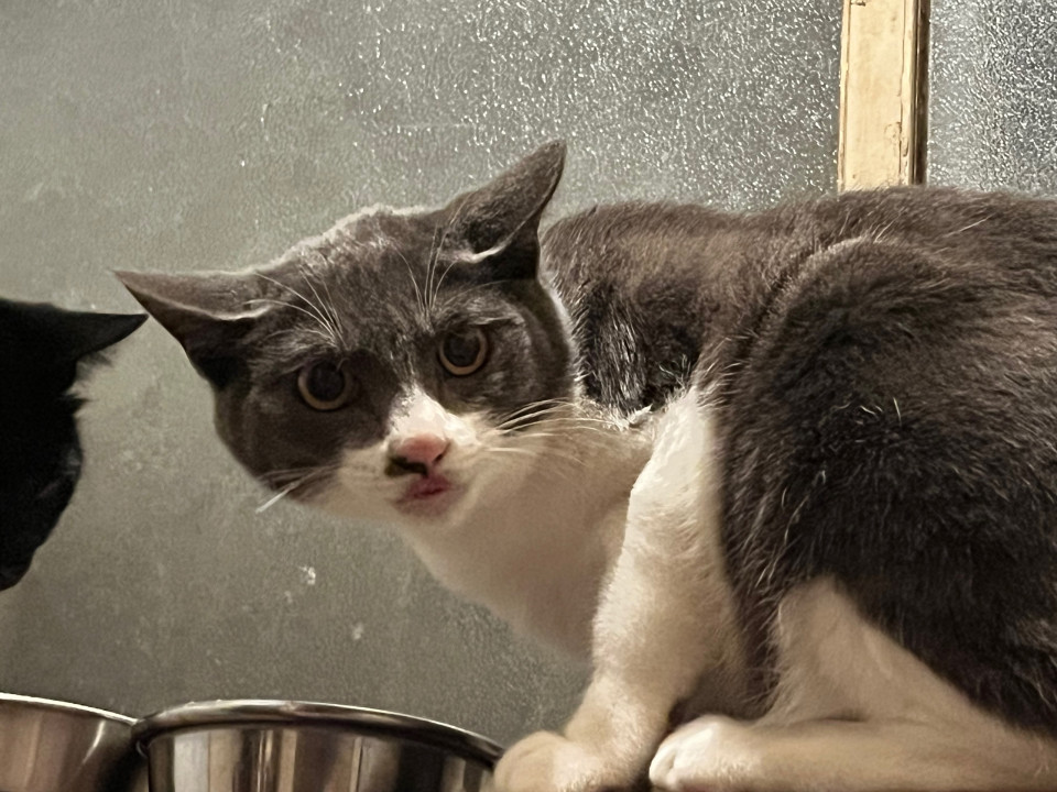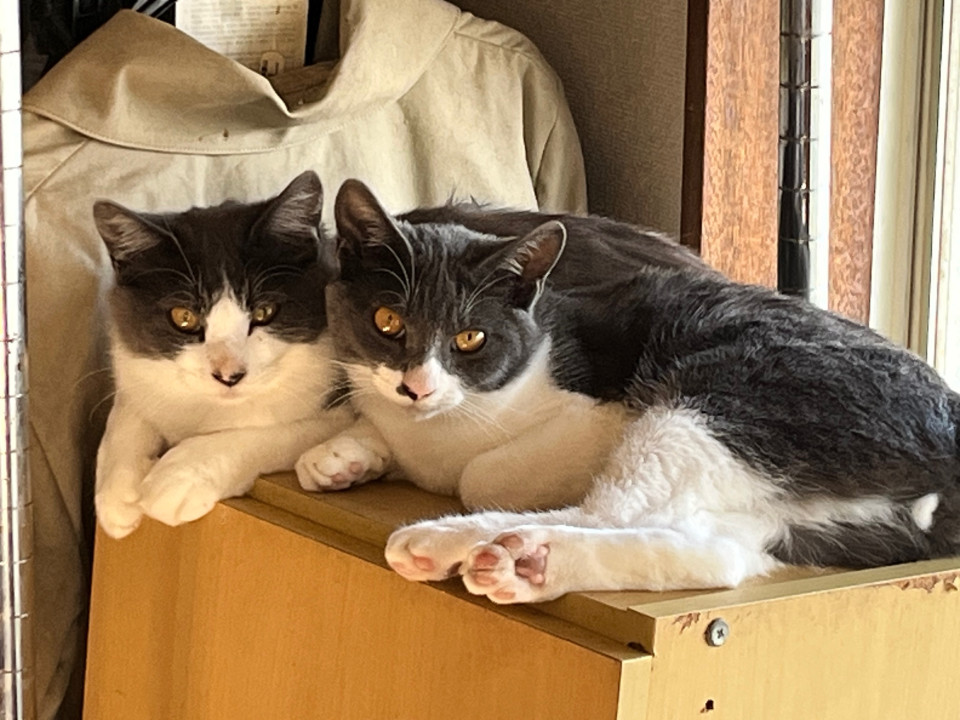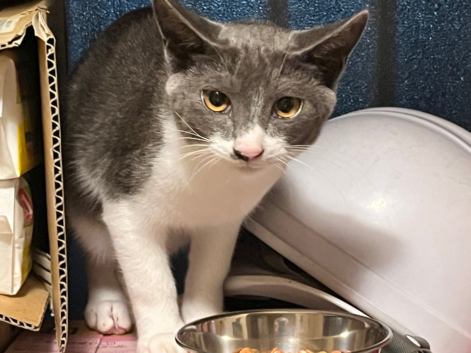 グレーと白の配色のネコさんです。ほかにも似た配色のネコが何匹か生まれています。なかなか触らせてもらえないので性別はわからないのですが、ちょっとした気の強さを見せているのでメス猫かもしれません。違ったらすみません。毎日、この写真の場所でえさをあげるのをまっているのがかわいいです。ごはんのときは近くで待っているのに、触ろうとすると怒られます。写真2枚目は、右がそうです。