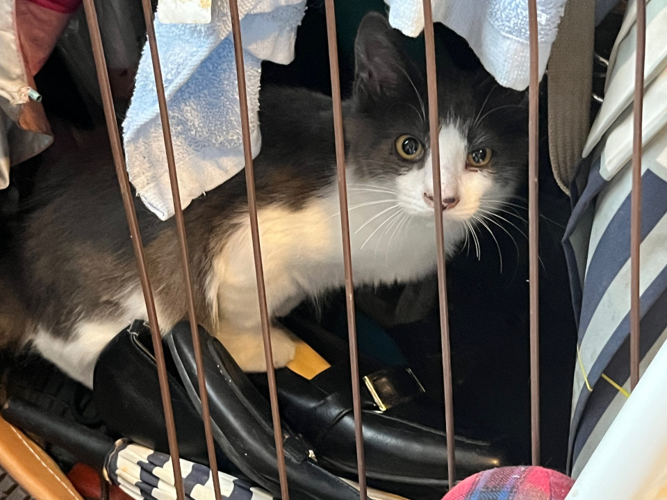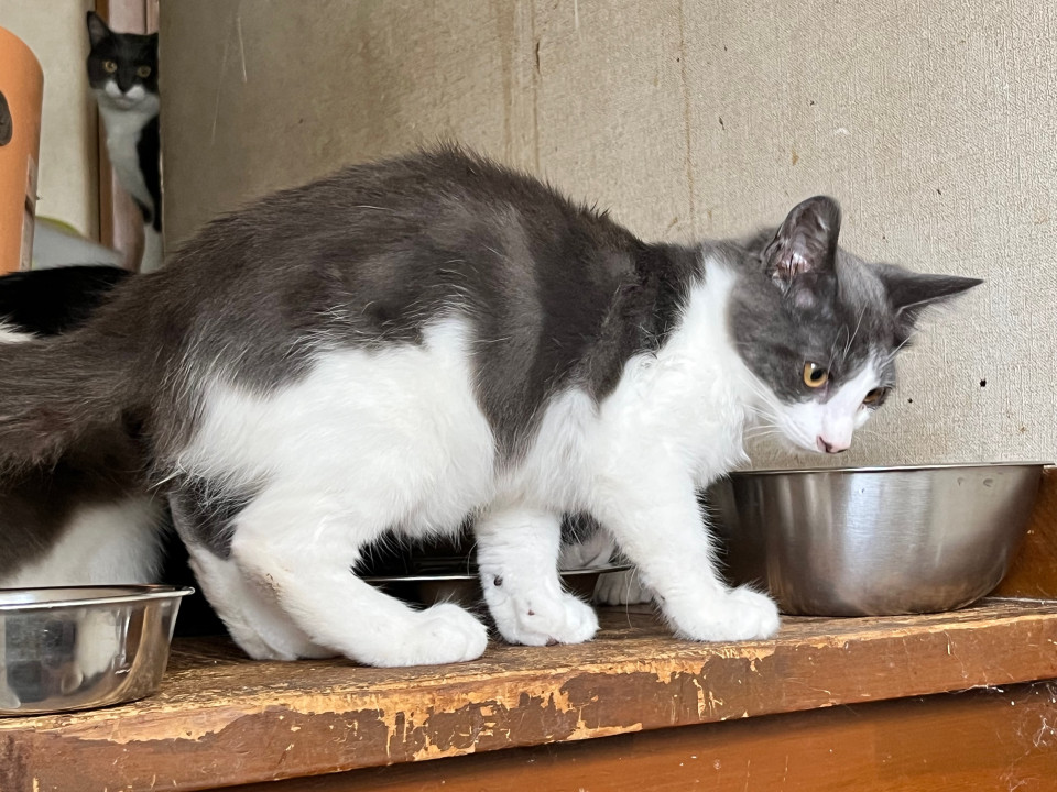 グレ白ちゃん。おなか側はだいたい白。おとなしい猫です。すぐに逃げていって、仲間の後ろに隠れてしまうタイプ。ごはんの時間には、えさばでうろうろしていますが、そうでないときはどこにいるのかという感じ。長毛ほい毛並みです。なかなか触らせてもらえないのと毛足がながいこともあり性別がまだわからないのですがメスっぽい気はします。あまり警戒感を植え付けるのもと思って無理に捕まえることはしていませんので、余計のびのびとほかの猫と家の中を駆け回っています。