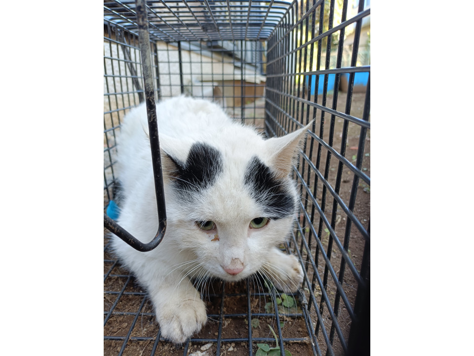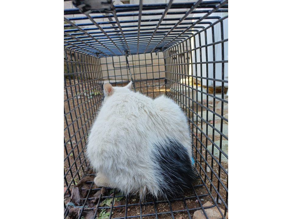 アライグマが出るためドッグフードとバナナを入れた箱罠が置いてあるのですが、この猫ちゃんがかかってしまいました。