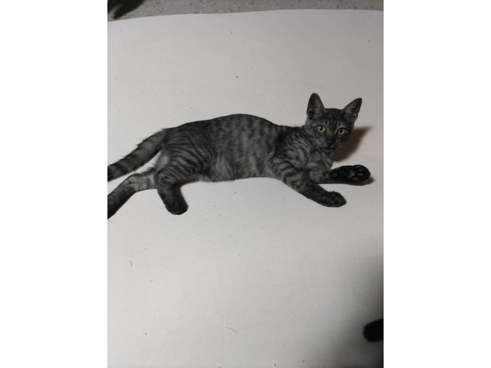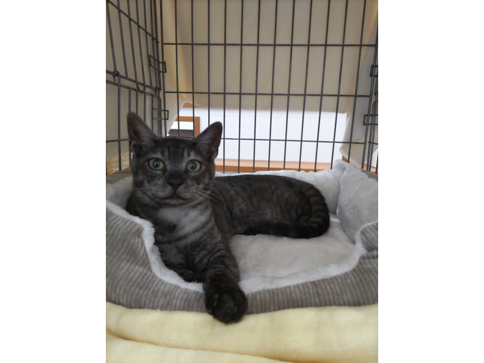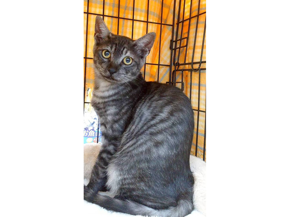 色柄がブラックスモークタビー(別名黒トラ)でとても神秘的です。見た目はかっこいいのですが、性格はわんぱくの甘えん坊さんで膝に乗りに来たり布団で一緒に寝たりします。猫じゃらしなどで遊んでもらうのも大好きです。