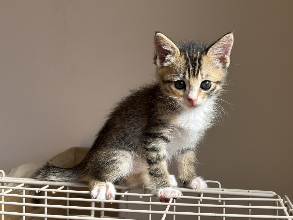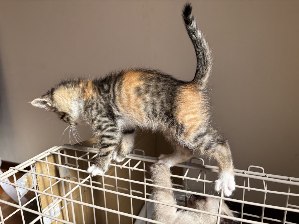 人がいると近くに来ようとして一生懸命ケージを登ります。人の身体もキャットタワー代わりにガシガシ登ります。すばしっこく、兄弟の銀次よりも身軽で、高いところも先に制覇できます。人がいると近くに来たがって甘えんぼさんに育っています。