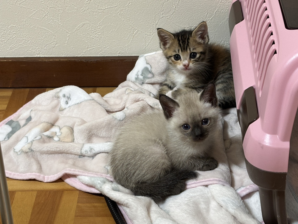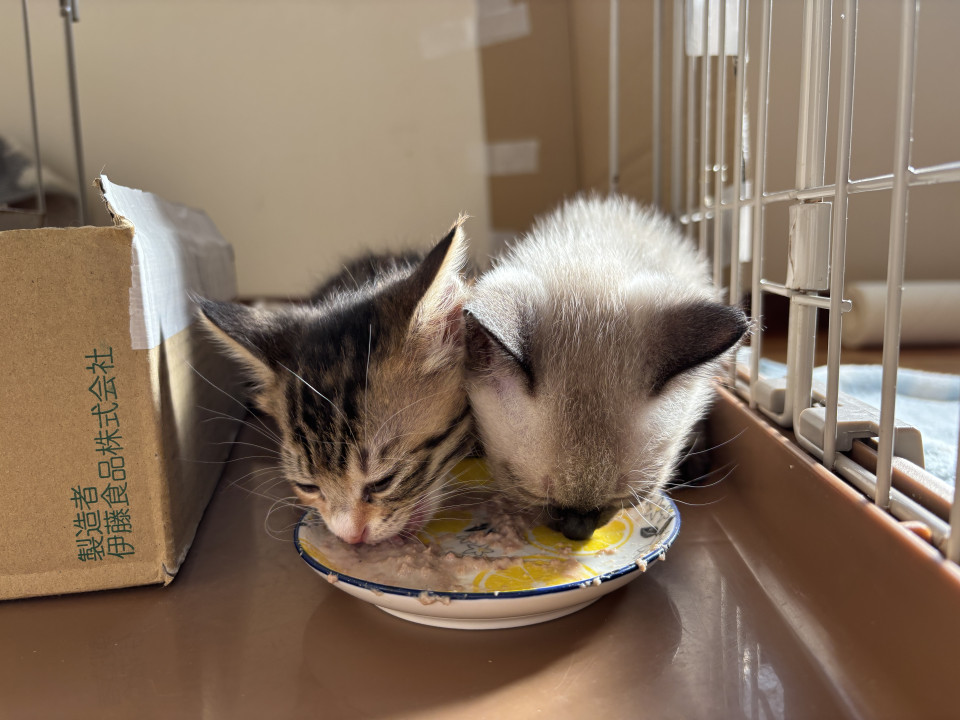 犬の散歩中、突然犬が草むらに突進して、子猫の鳴き声が聞こえ、草むらの中に乳飲み子猫が2匹落ちていました。少し待っても母猫が来る様子はなく、そのままだと死んでしまうため保護し、ずっとの家族を探すことにしました。