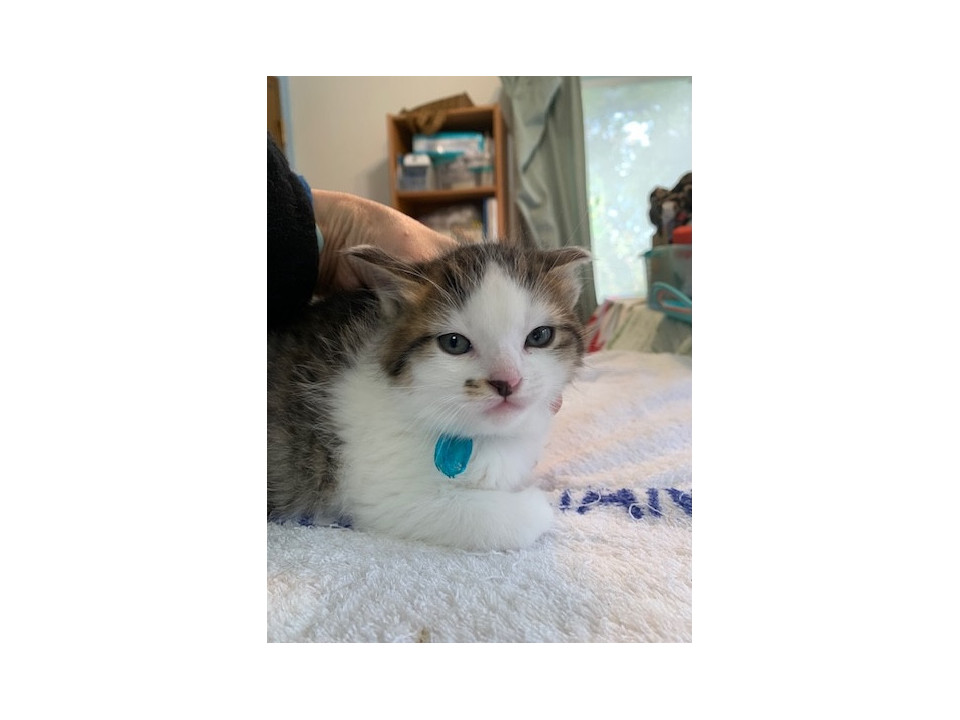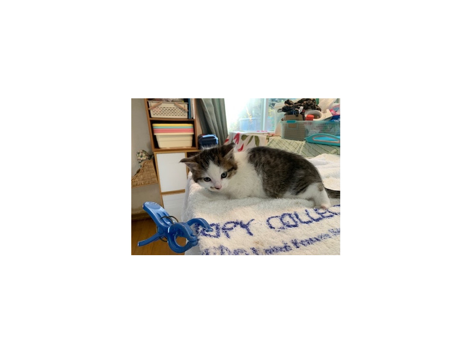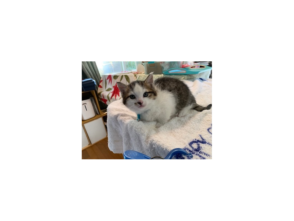 可愛いコロッコロのキジトラの男の子、アレクサ君です。大きな頭に小さなお目目、コロコロのもふもふでぬいぐるみのような可愛さです。頭も体も手足も大きいので、大きな子に育つのでないでしょうか?野良ちゃんの子なので、少しだけ人を怖がるところがありますが、体を硬くする程度ですぐになれてくれると思います。どちらかというとおっとりさんですが、猫をかぶっているだけかもしれません。子猫らしく、兄弟とはわちゃわちゃ楽しく相撲をとっています。