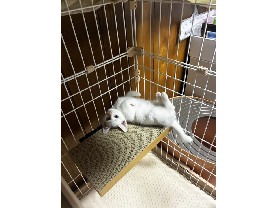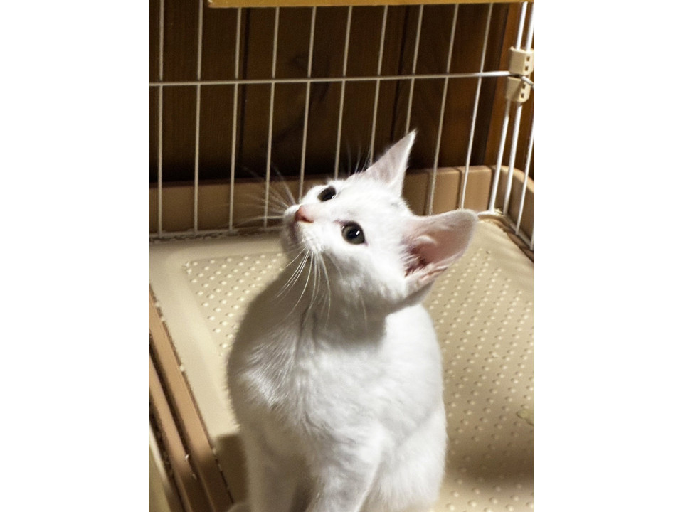 【性別:年齢:被毛】♂:4ヵ月:白(頭の黒濃)