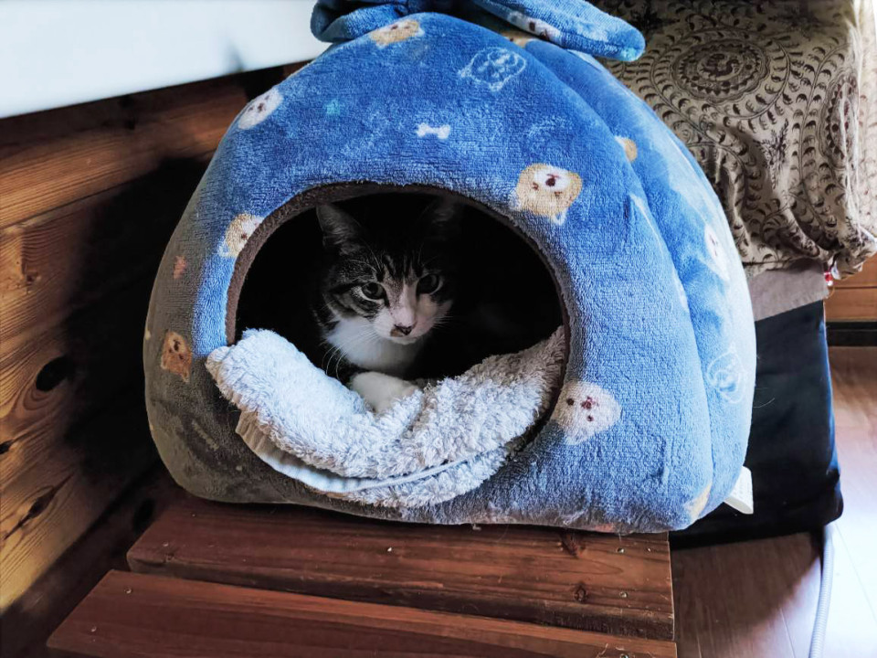 日中は通常の猫砂にもちゃんとトイレして、夜間とは別のベッドで寝ていてオシッコはしません。