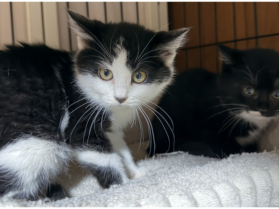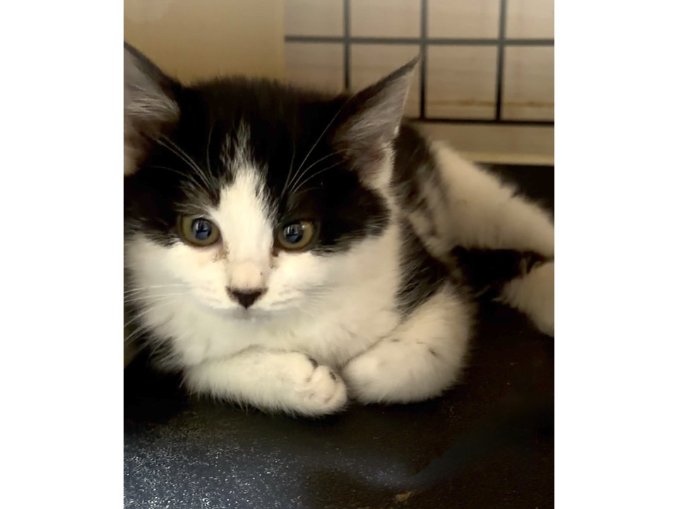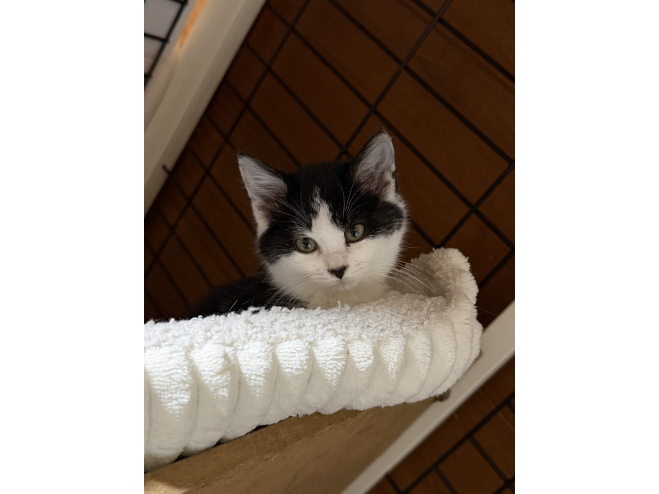 顔が丸くて毛がフワフワのハチワレ猫ちゃんです。保護されてすぐはシャーシャーでしたが、だいぶ触れるようになっています。
