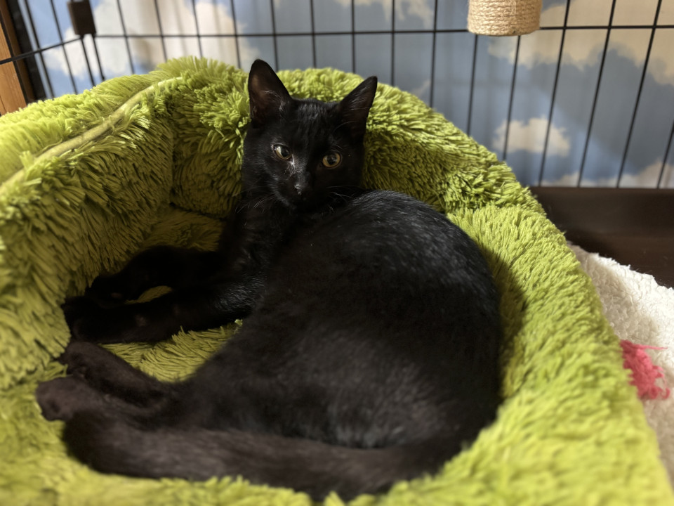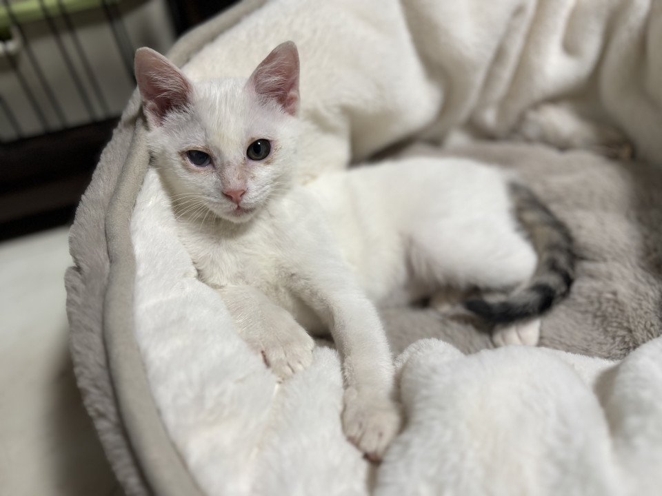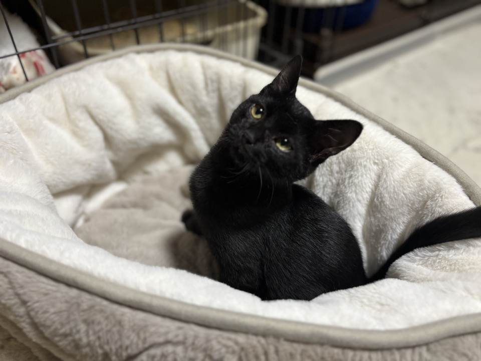 台風が過ぎ去った日の夕方、車が行き交うスーパー近くの道路脇でうずくまっている小さな子猫をスタッフが見つけ、急いで保護しました。事故にあったのか口から血が出ていて、よく見ると下唇が歯ぐきから剥がれています。体重300gと小さすぎるため麻酔をして手術をすることができませんでしたが、9月13日に剥がれた唇を縫い合わせる手術を受けました。現在元気にご飯を食べています。9月30日にトライアルに行きましたが先住猫との相性が合わずに戻ってきましたので、再募集しています。