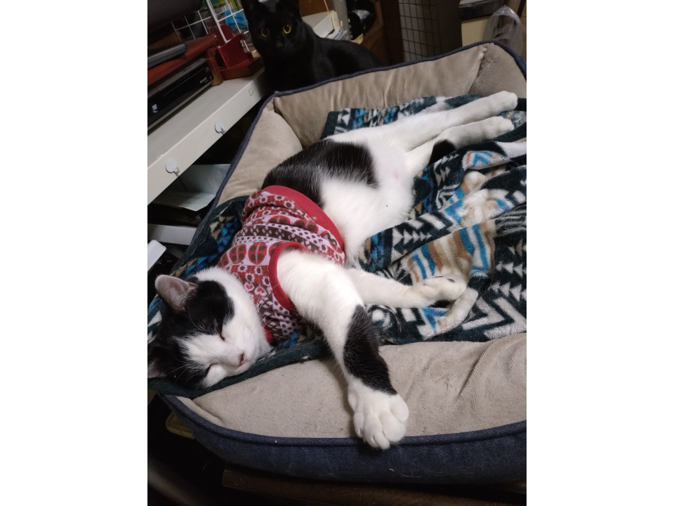 注射をしたところが気になり舐め続けたため、やむを得ず洋服を着せています。