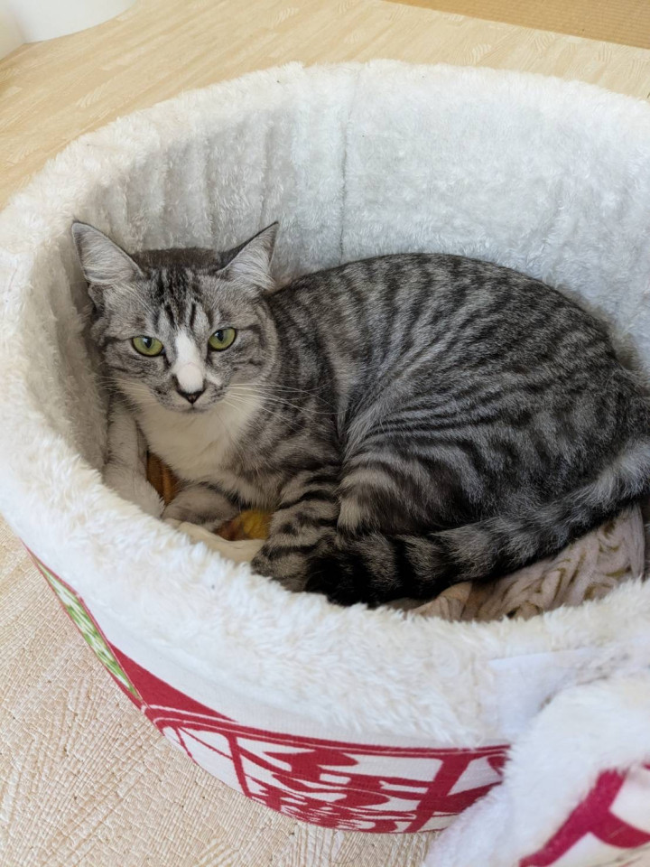 人通りも多く車通りも多い場所でいつも隠れて暮らしていたため、人馴れに日数がかかりましたが、今はとても猫が好きで、預かりさん宅のお姉さん猫たちと仲良く過ごしています。怖がりで人見知りさんですが、穏やかな性格です。