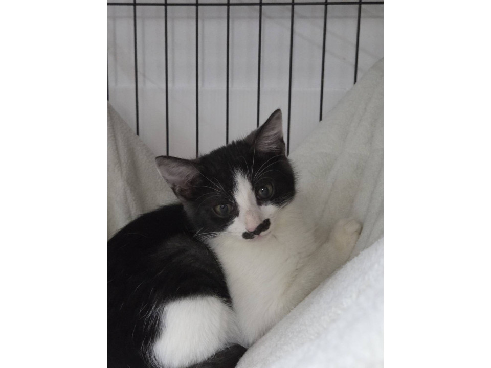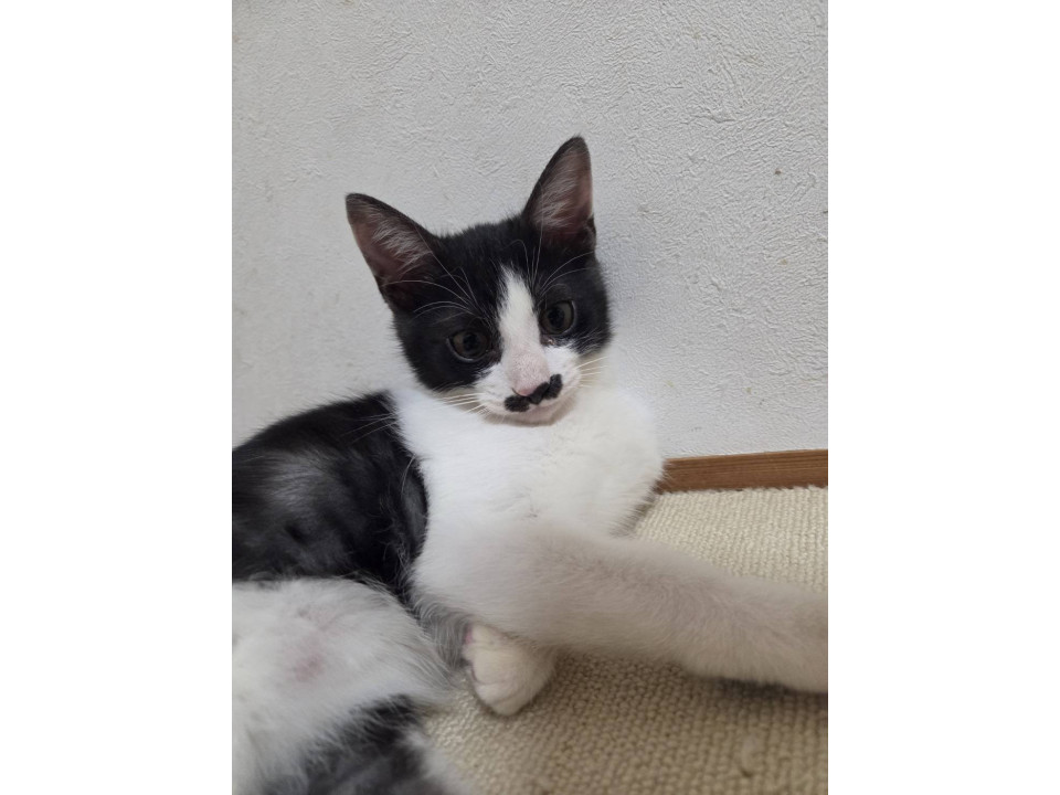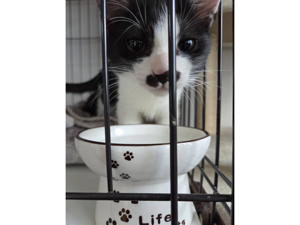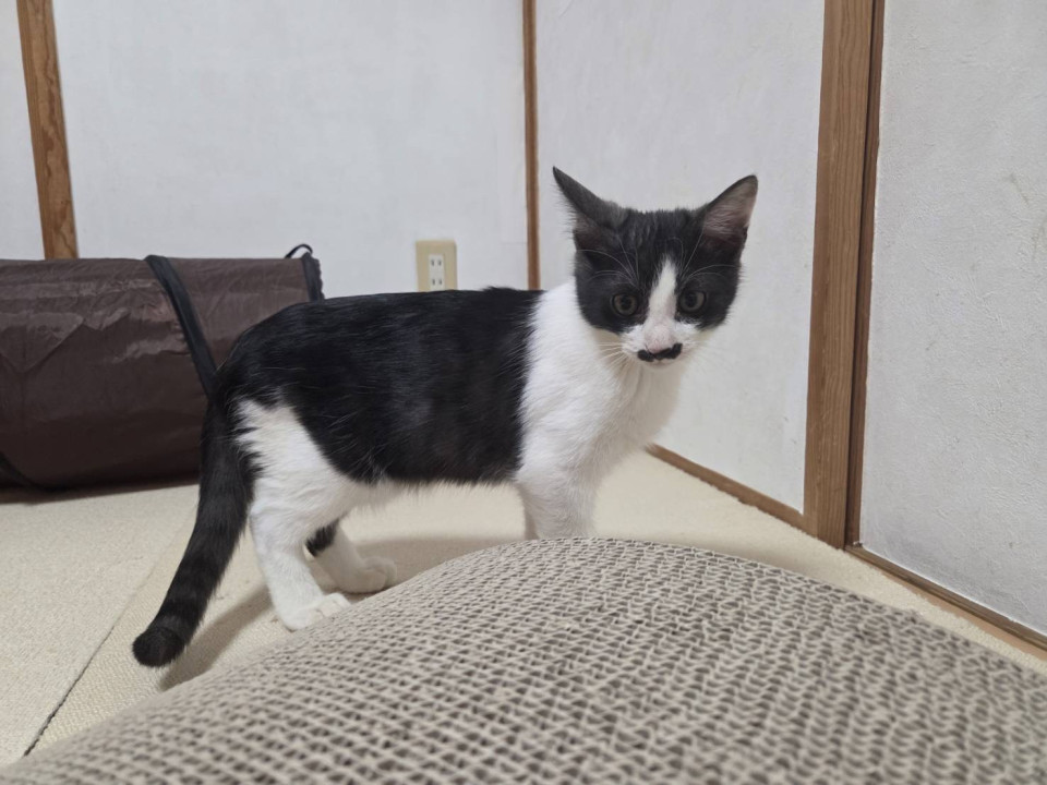 ○生後3ヶ月半くらい(2025年12月時点)の黒白ハチワレの男の子です。