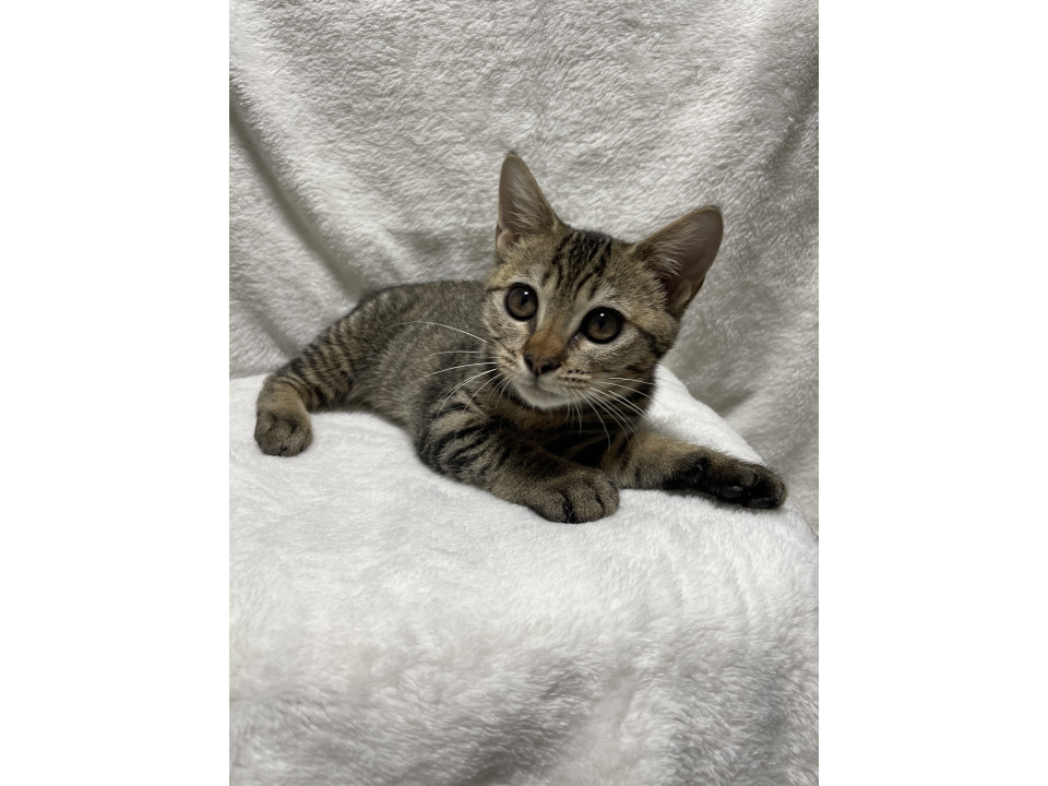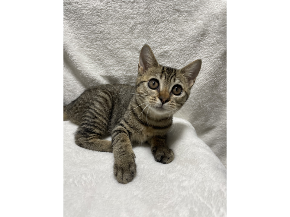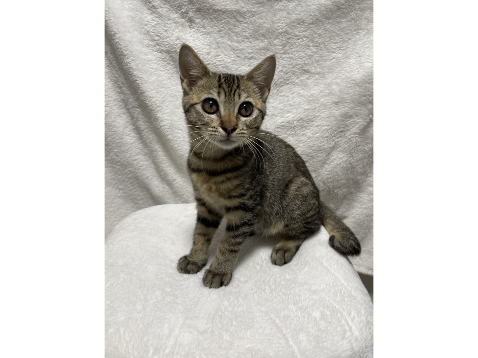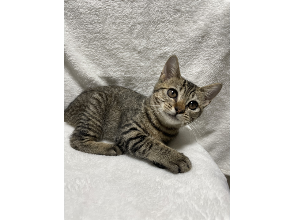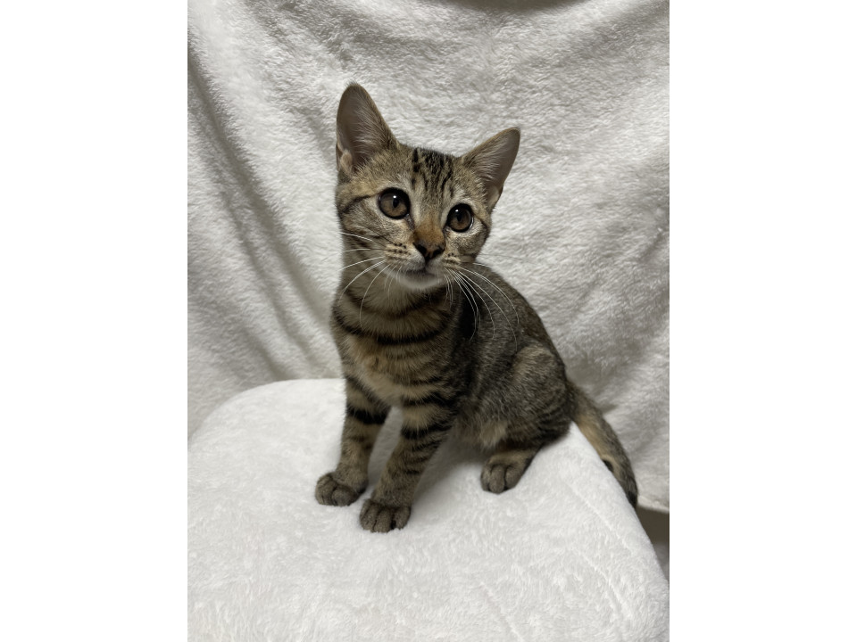 目がクリクリしたキジトラの女の子で尻尾は少し短めです
