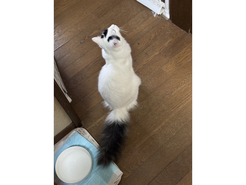 ○長毛で身体の大部分が白で、頭との一部と尻尾が黒い